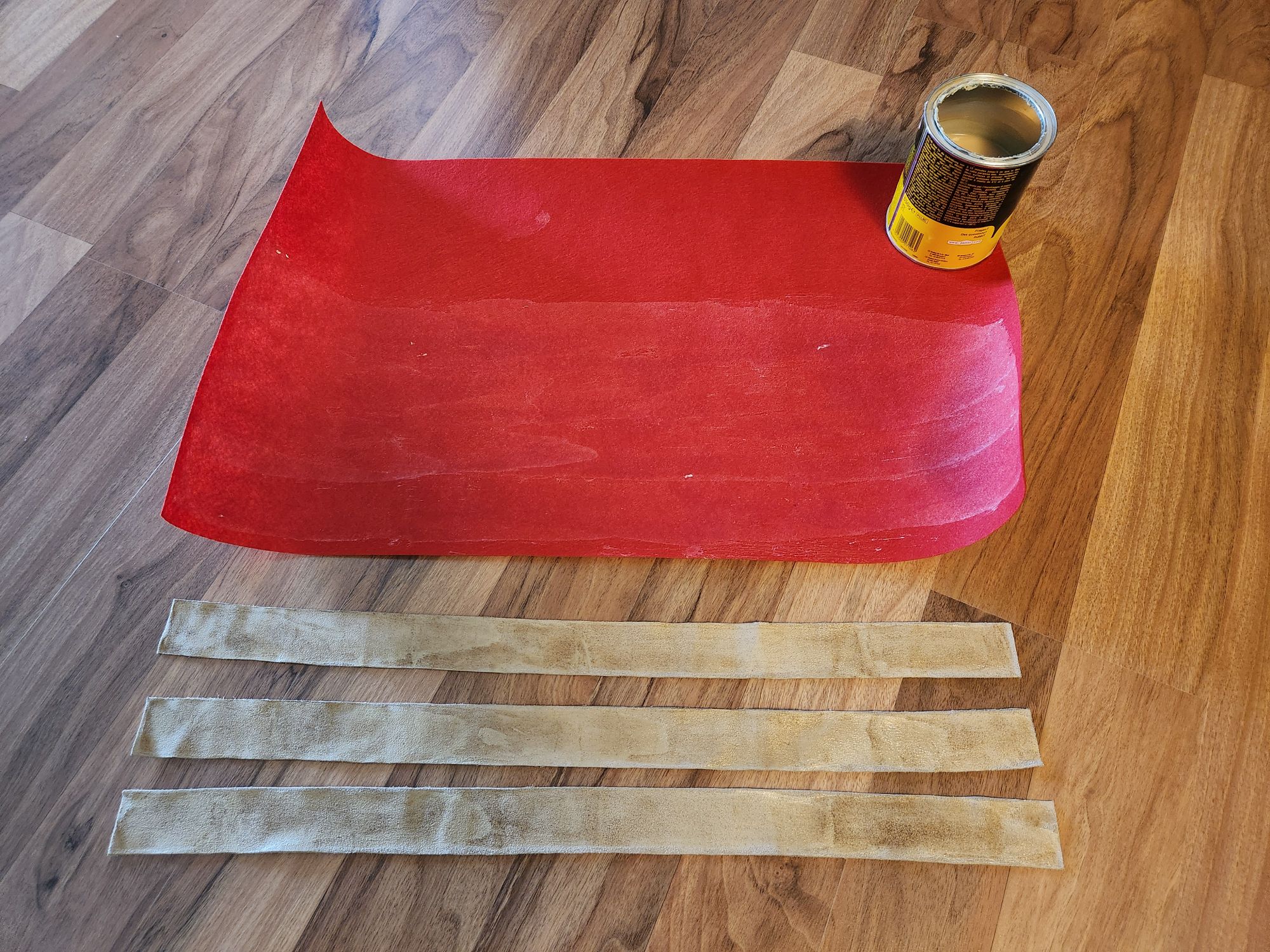 Dann hab ich die 4 Halteriemen auf die angegebenen 30x3,5cm zugeschnitten, habe dann aber optisch festgestellt dass die Maße nicht dem entsprechen was auf den Fotos des fertigen Köchers zu sehen ist. Durch Größenvergleichs-Schätzungen bin ich dann auf etwa 36x3cm gekommen. Also nochmal neue zugeschnitten und sieht für mich gut aus.