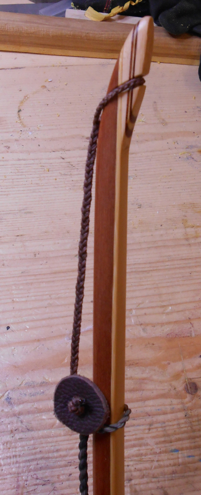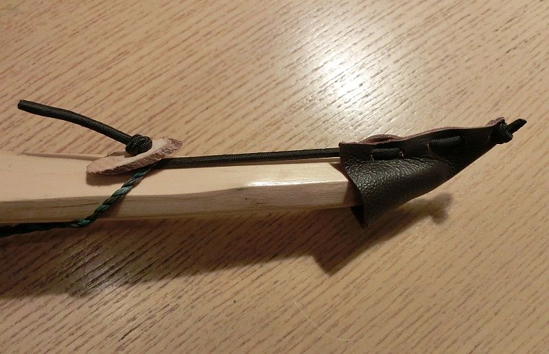 die Sucherei "wo ist jetzt wieder die Sehne zum Bogen" hat genervt, daher hab ich mir einen einfachen Sehenenhalter gebastelt. Nähen von Leder ist nicht meine Stärke, daher: in der Bucht 3mm Gummischnur gekauft (10m reichen für ein paar Halter..), ein Lederrestchen mit der Lochzange bearbeitet, ein Eibenästchen schräg abgesägt, Loch gebohrt, Gummischnur durchgefädelt, Knoten rein, fertig. Quick and not completly dirty ;)