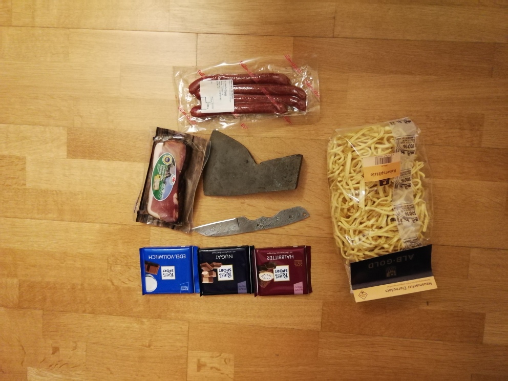 danke an meinen Wichtel das ist ein ganz tolles Paket, etwas Deftiges, etwas Süßes, ein tolles Messer und ein Axtkopf. Wie man mit Nahrungsmittel umgeht weis ich, zum Messer und dem Axtkopf muss ich noch nachschlagen, einfach Griff und Stil fertigen, schärfen und fertig??