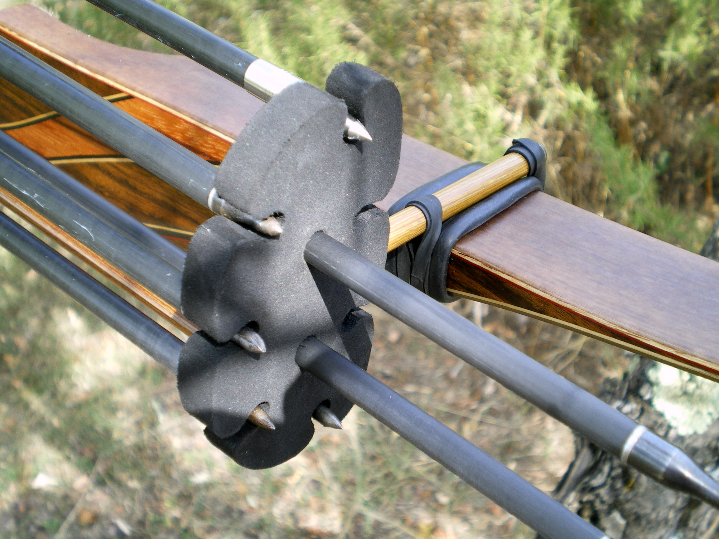 Ich befestige die Pfeile an diesem BK so, indem ich die Spitze an der oberen Klemmleiste hineinstecke, wie an einem BK mit Schutzkappe und an der unteren Klemmleiste den Schaft einklemme (siehe ein Bild Anfang Präsentation). So bekommt man den Pfeil problemlos mit nur einer Hand vom,bzw. an den Köcher. Nur die zwei Pfeile zur Stabilisierung des BK sind oben und unten mit dem Schaft in den Klemmleisten eingeklemmt,bzw. stecken in den mittleren Löchern. Problem bei Holzpfeilen - die Spitzen an Holzpfeilen haben fast immer einen grösseren Durchmesser als der Holzschaft. Deshalb sollten diese Pfeile eher nicht durch die zwei mittleren Löcher am BK gesteckt werden, sondern in den zwei Klemmlöchern an der Bogenseite eingeklemmt werden. An Carbon-oder Alupfeilen ist meistens der Schaftdurchmesser gleich dem Spitzendurchmesser und so für die Lochmontage als Stabilisierung und Reserve kein Problem. Sitzen die Schäfte zu straff- Klemmlöcher aufbohren ist kein Problem, kleiner machen dann schon eher.
