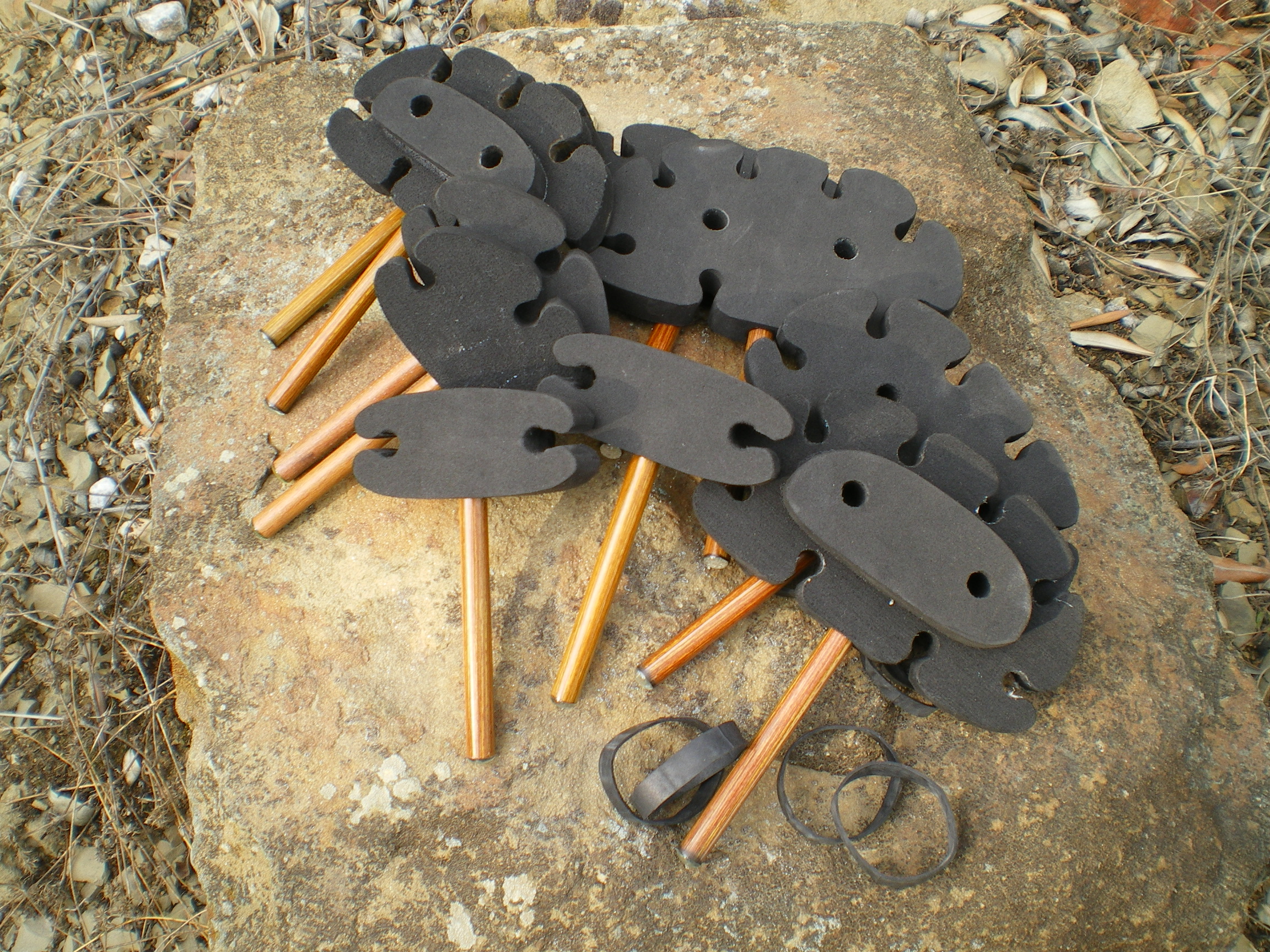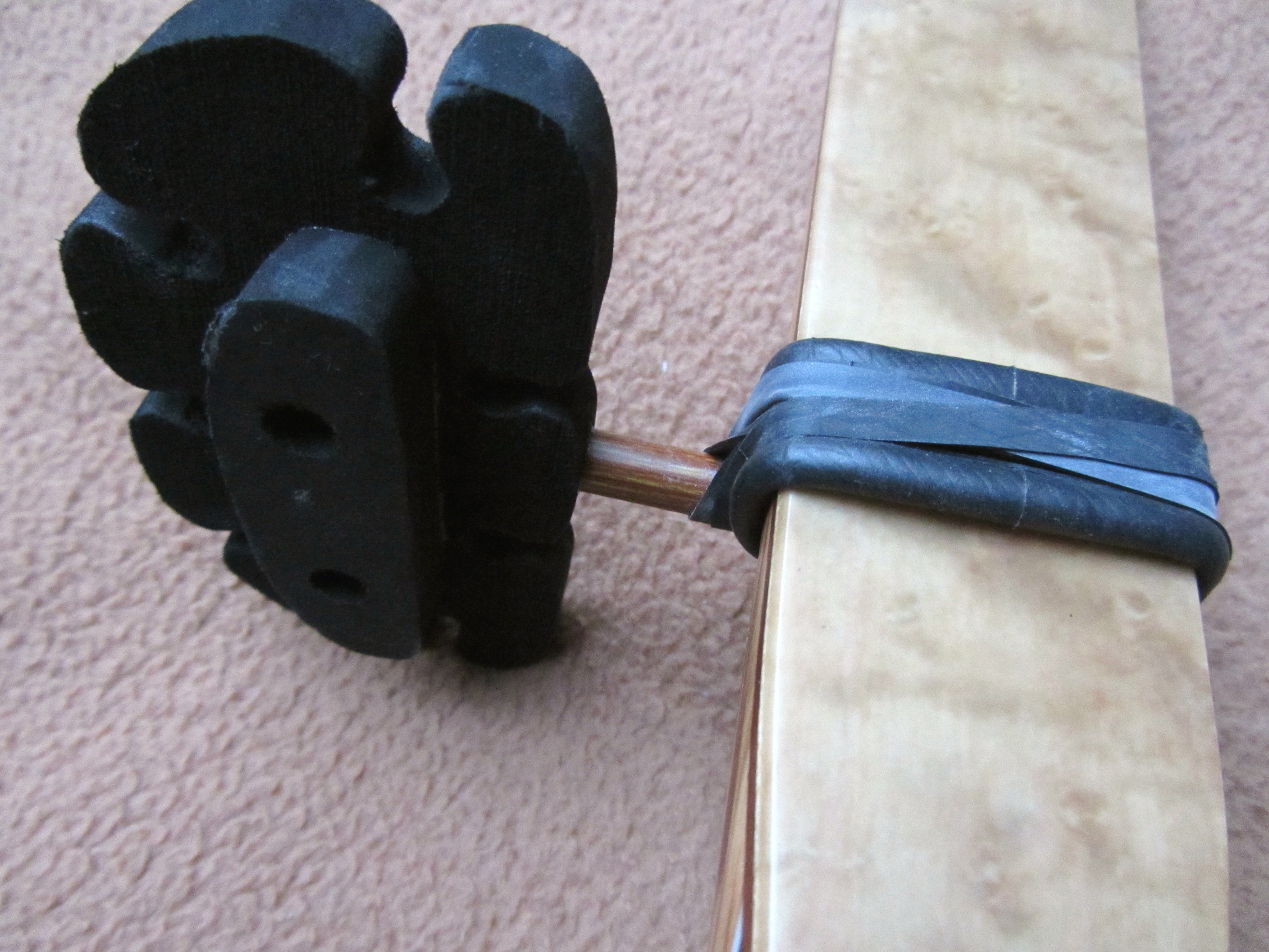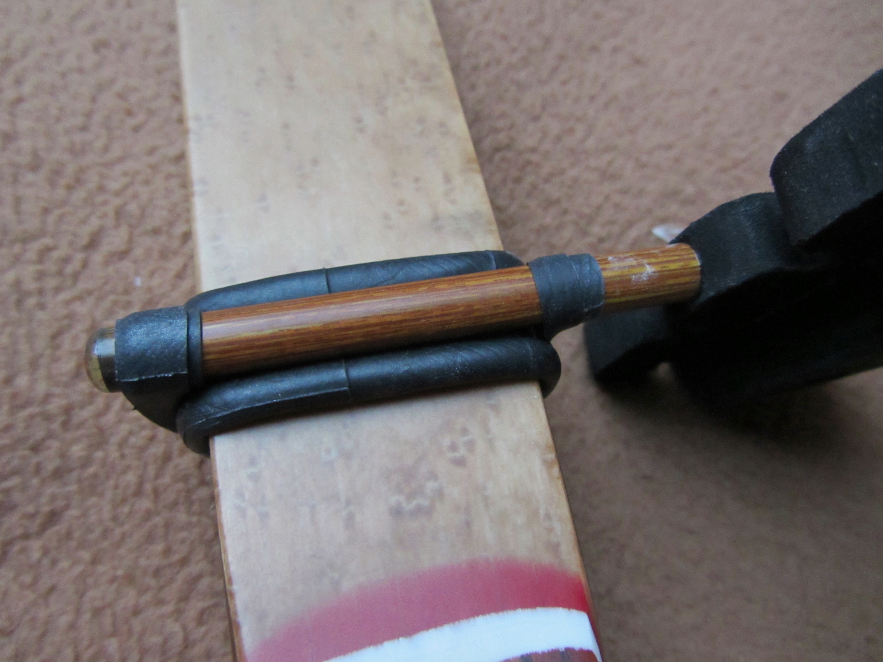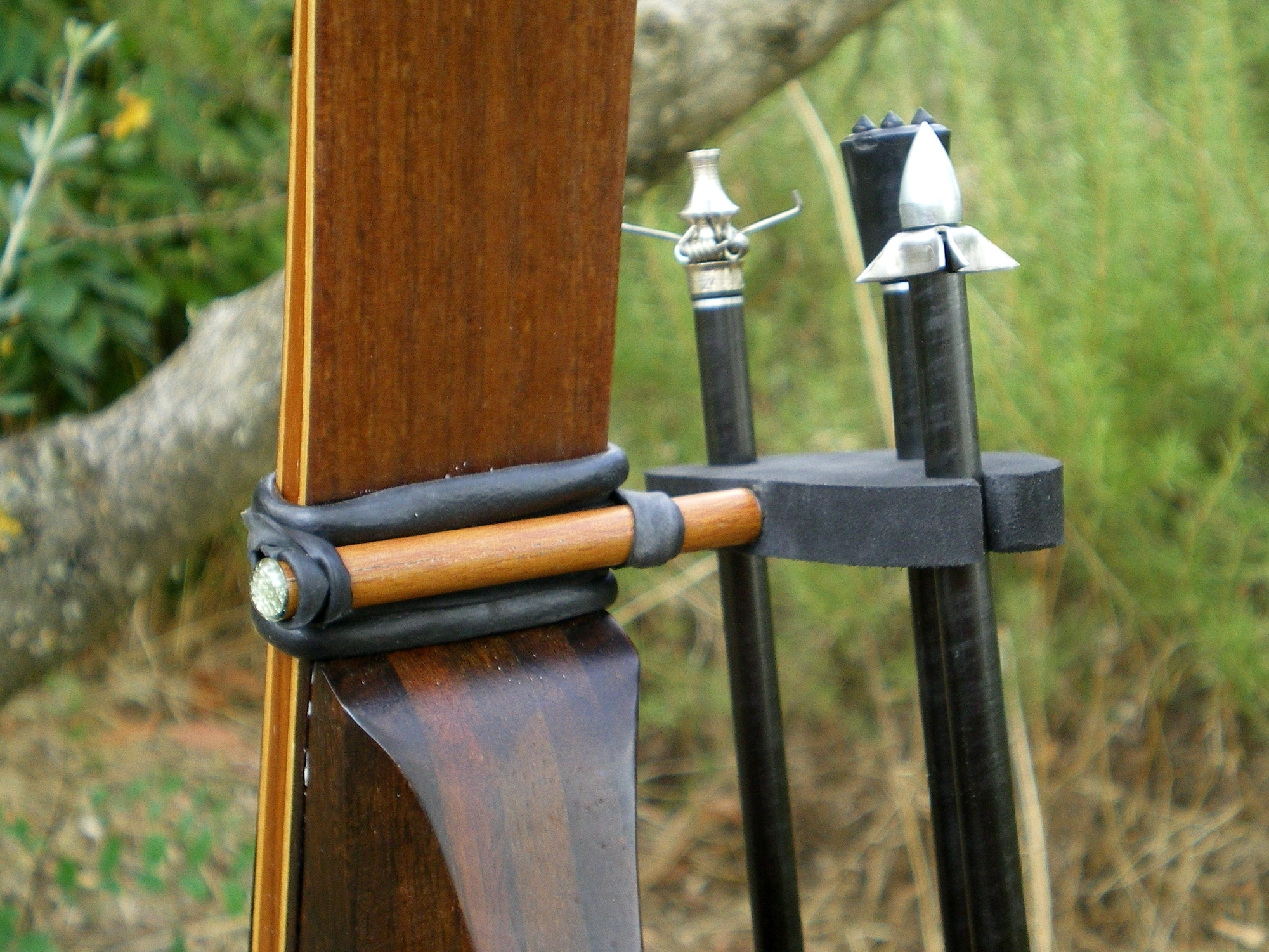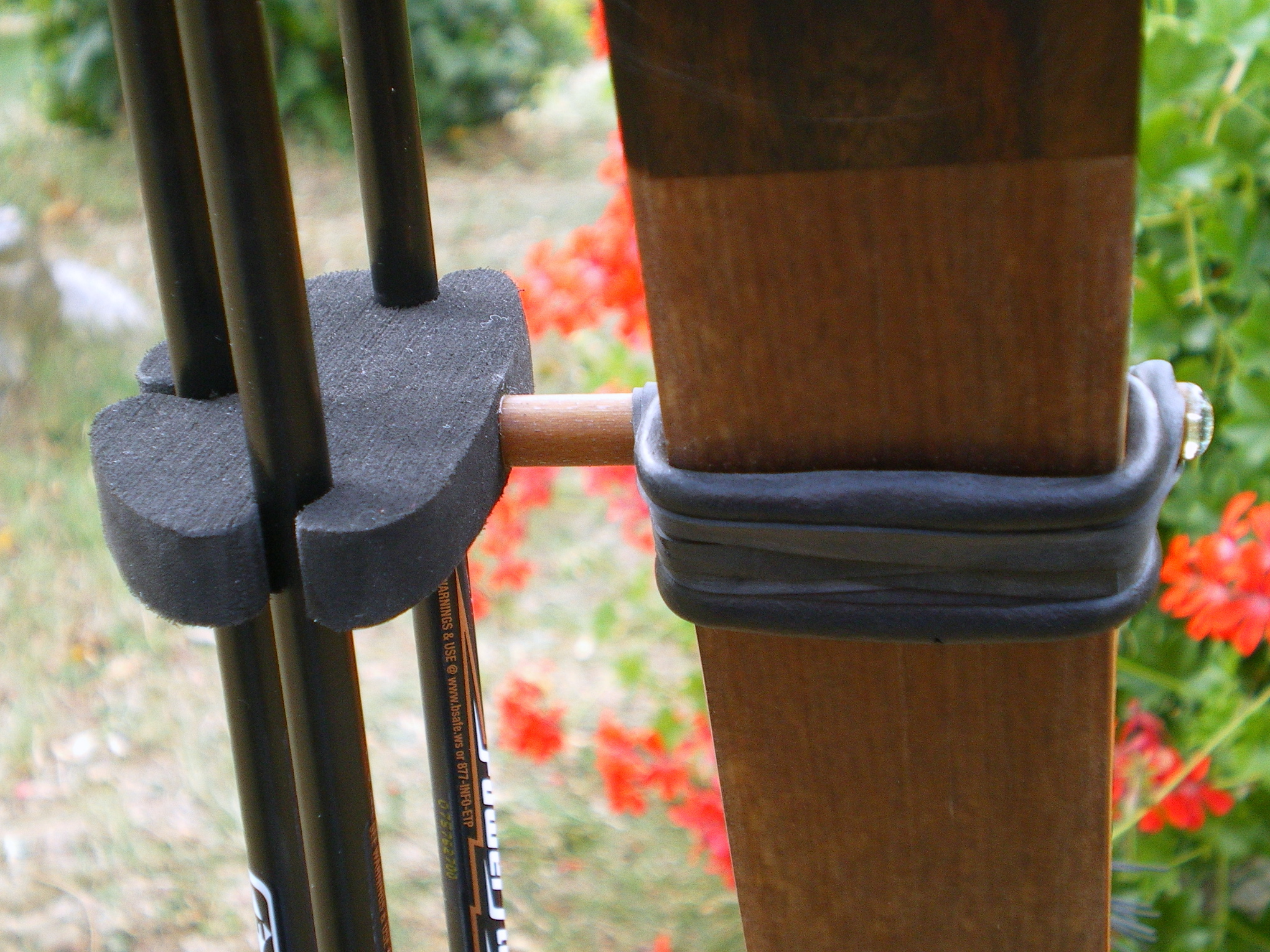 Kann ich, aber nicht heute. Die Wurfarme werden vor der Montage dauerhaft mit einem Stück Fahrradschlauch unterfüttert, so klappert und verutscht nichts und die beiden Köcherteile mit je zwei Gummis vom Fahrradschlauch befestigt. Hält richtig gut. Mit einen oder zwei montierten Pfeilen wird der Köcher in sich stabil.