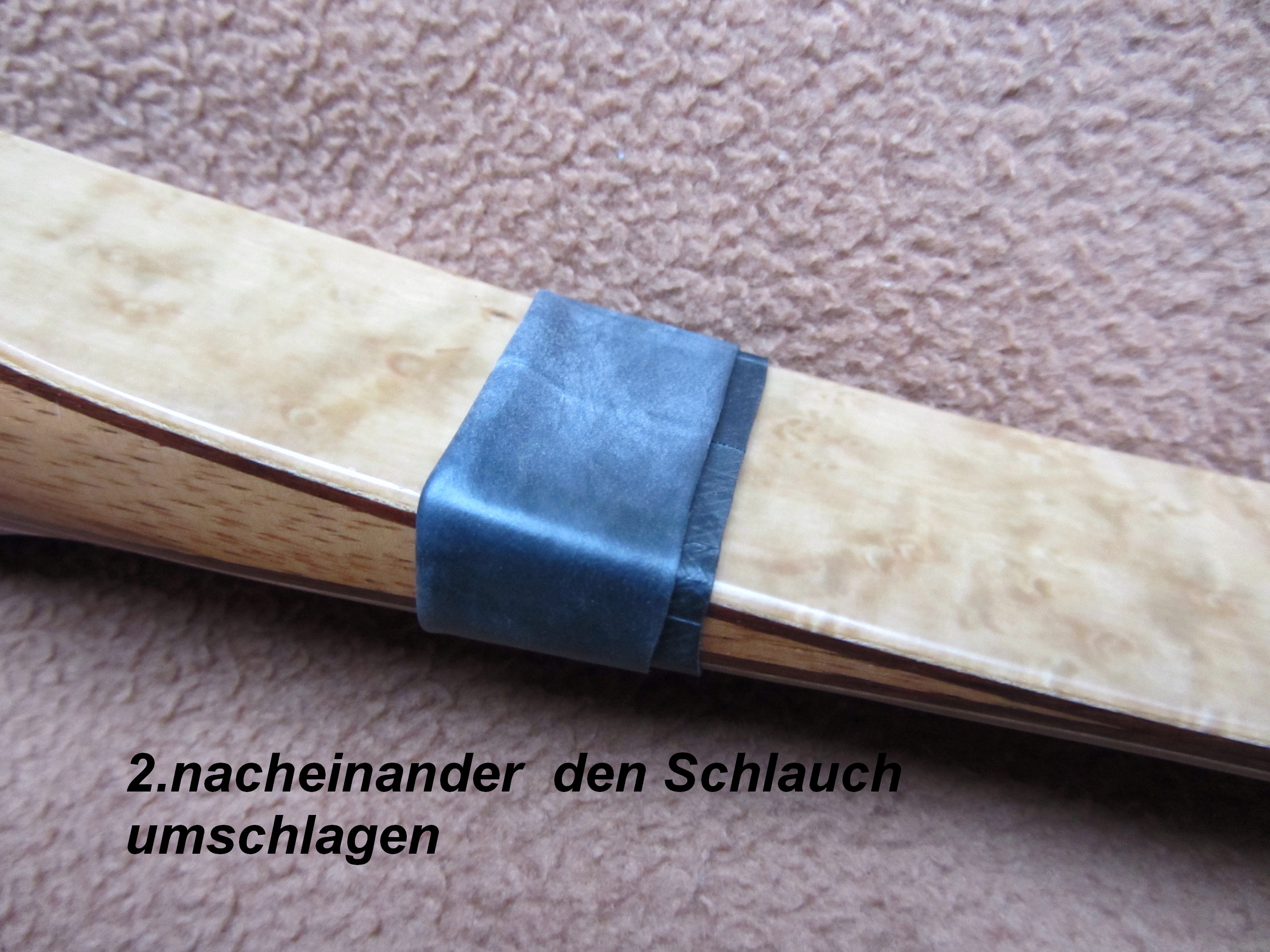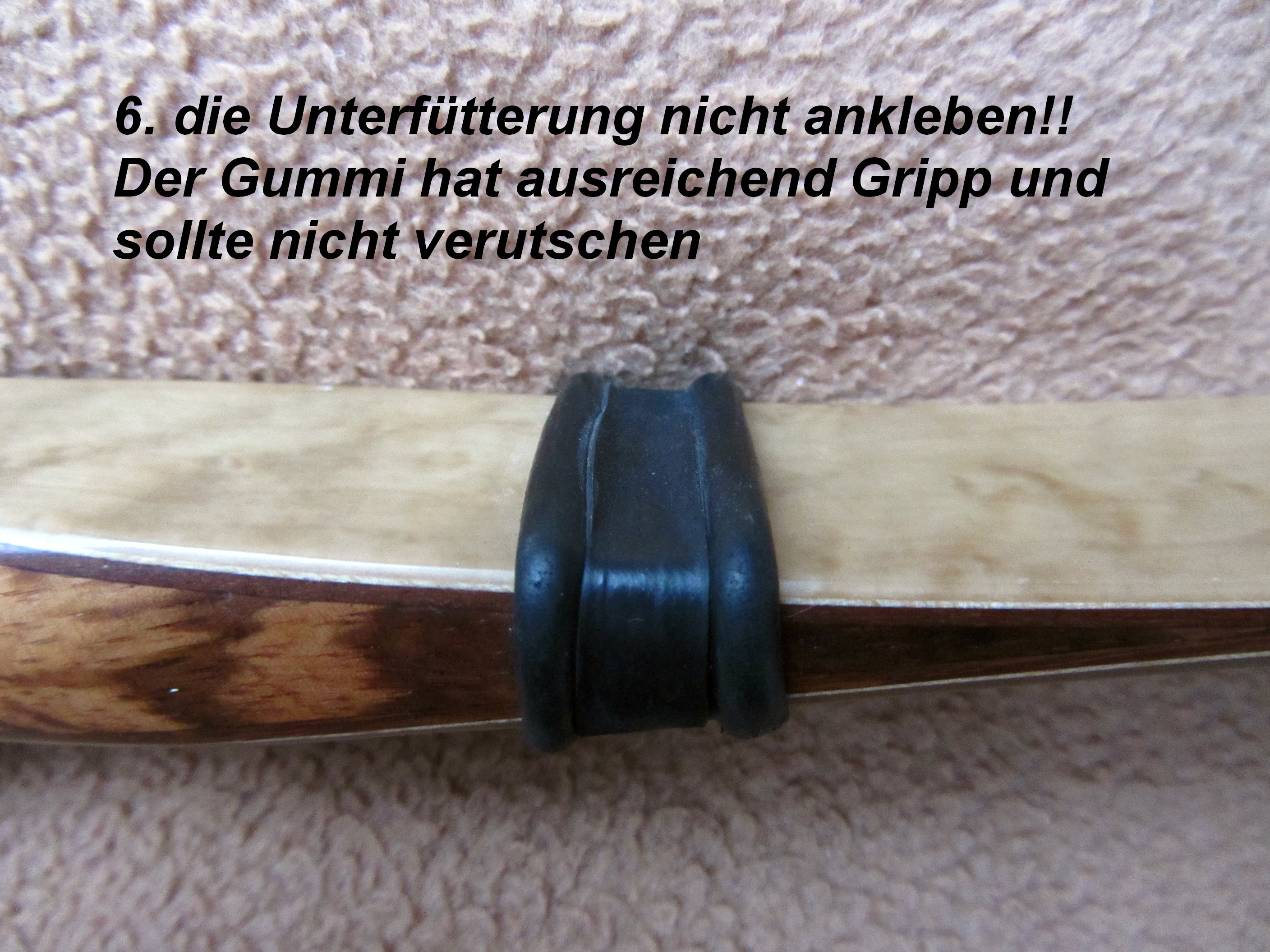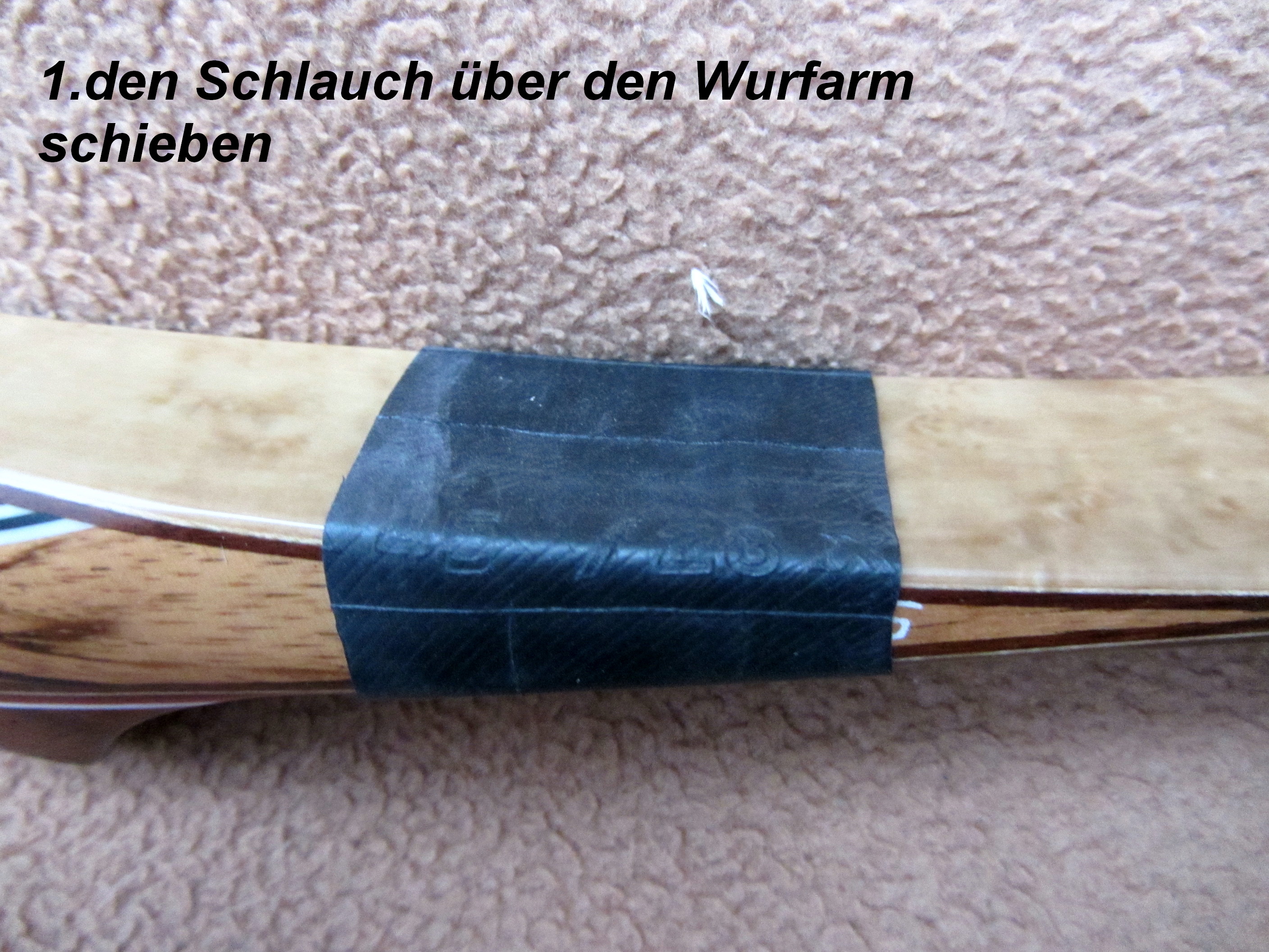 Das Anbringen einer Unterfütterung am Wurfarm des Bogens verhindert ein mögliches Klappern und ein Verrutschen des Bogenköchers auf dem Wurfarm. Den Schlauch nicht ankleben!! So kann er jederzeit wieder entfernt werden. Der Gummi besitzt ausreichend Gripp.