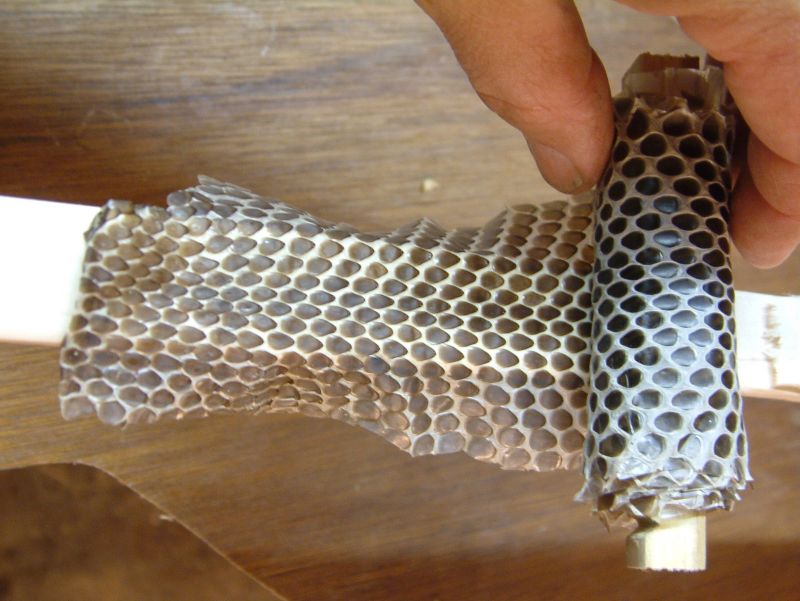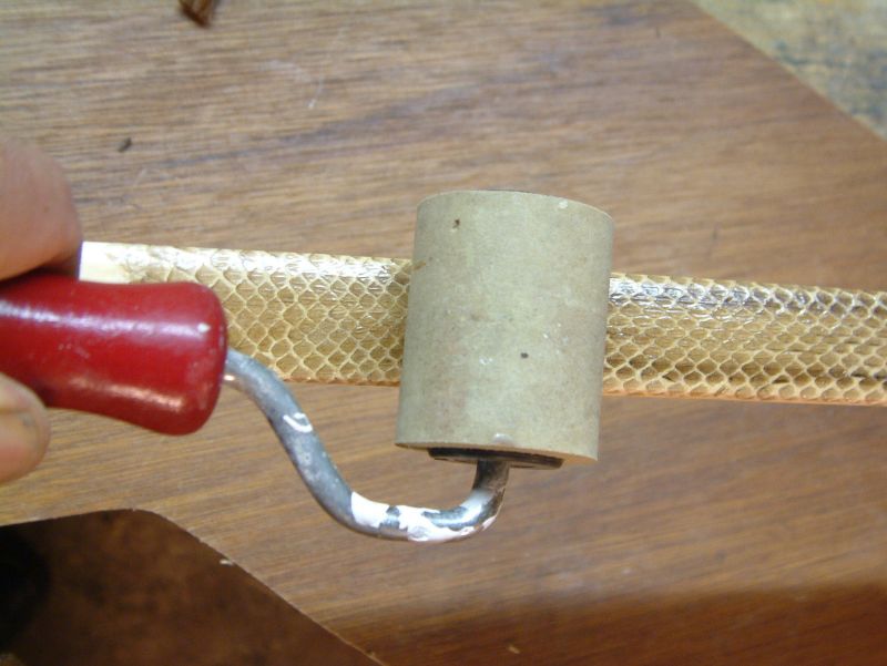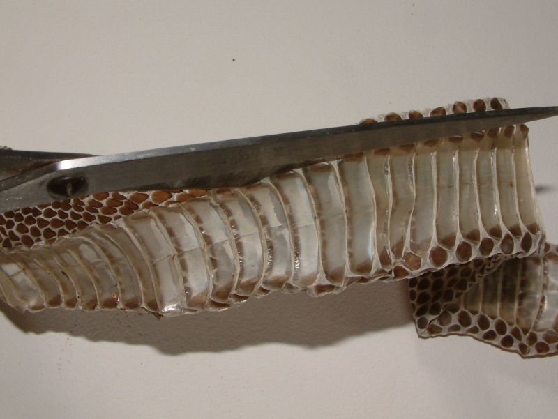 Danach wird die Haut aufgerauht für die Lackierung. Diese ist zwingend notwändig. Man muss sich das so vorstellen: Auf dem Holz wird die dünne Hornhaut mit dem Kleber fixiert, auf der Oberseite ist sie noch ungeschützt und kann u.U. leicht abgerubbelt werden. Ich rauhe immer mit Stahlwolle auf. Wenn sich hierbei die Schuppen lösen, haben wir nicht immer ein Problem. Es gibt Schlangenhäute, bei denen halten die Schuppen, bei den Natternhemden ist es ähnlich, z.B. bei der Vierstreifennatter halten sie, bei der Peitschennatter nicht. Werden nun die Schuppen runtergerubbelt, so hat man immerhin noch eine Schlangenhaut-Struktur, die auch ganz gut aussehen kann (Bild kommt später).