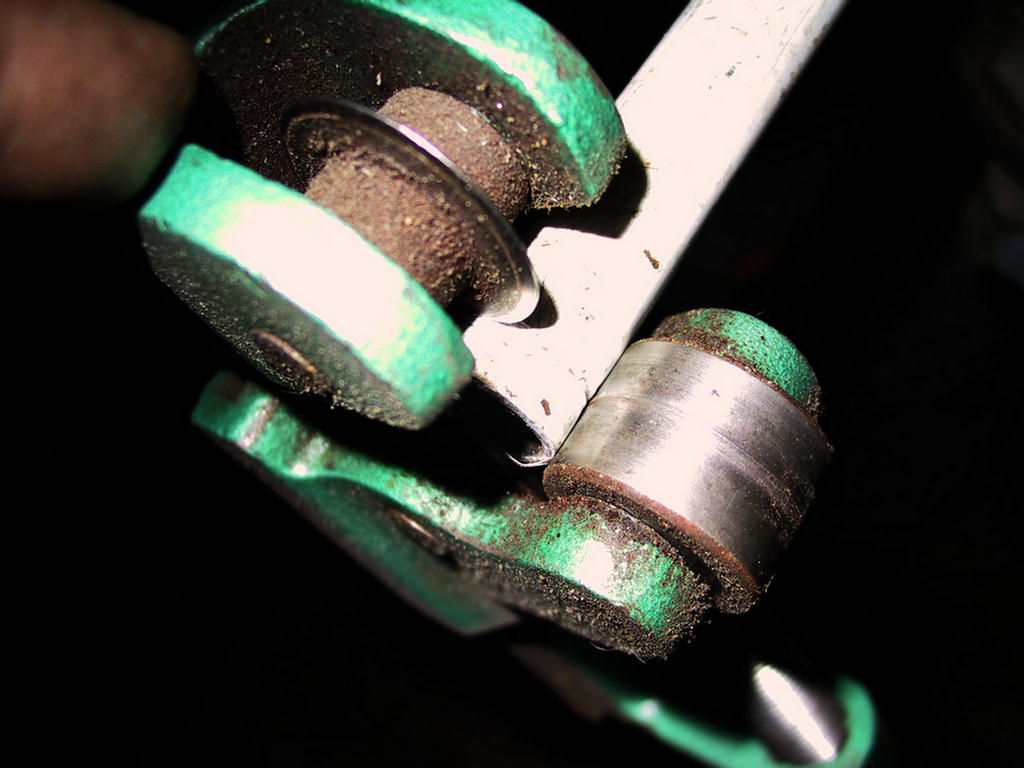 Jetzt brauch man noch zwei Hülsen/Ringe, die davor schützen, daß sich die Holzgriffe aufspalten, wenn man die Erl einschlägt. Diese schneide ich von einem passenden dünnwandigen Rohr (z.B. aus alten Gartenmöbeln) zuerst mit einem Rohrschneider und dann mit der Metallsäge ab. Das mit dem Rohrschneider muß nicht sein, ergibt aber einen schönen innenliegenden Grat im Ring, der als Anschlag am Holz dient. Das gesägte Ende des Rings muß sauber (vor allem innen) entgratet werden.
