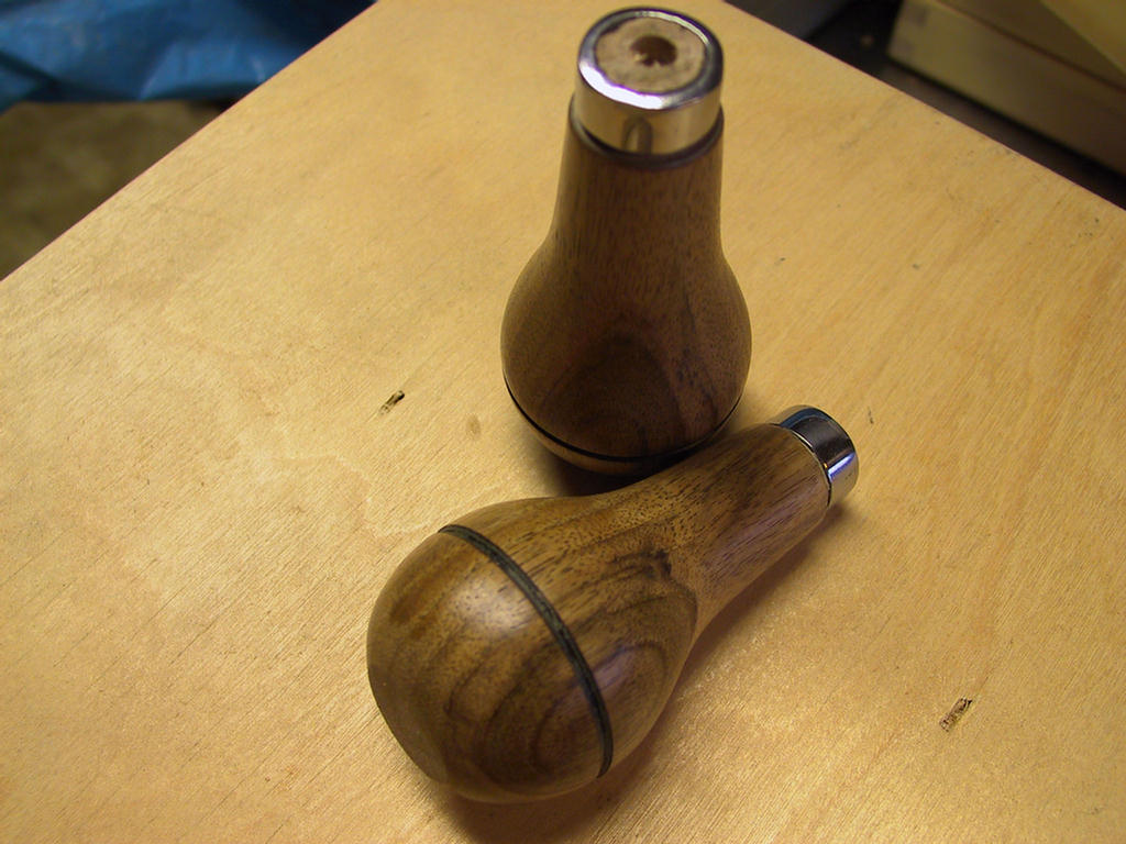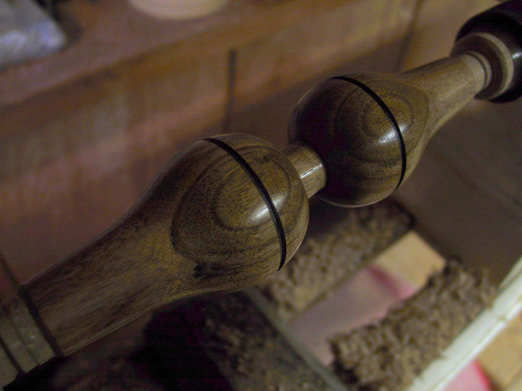 Auf der Drechselbank habe ich aus Nußbaum (so was liegt bei mir immer herum) die Griffe gedrechselt. Dabei ist bei den Passungen der Ringe auf etwas Übermaß zu achten, damit diese auch ohne Kleber stramm sitzen.