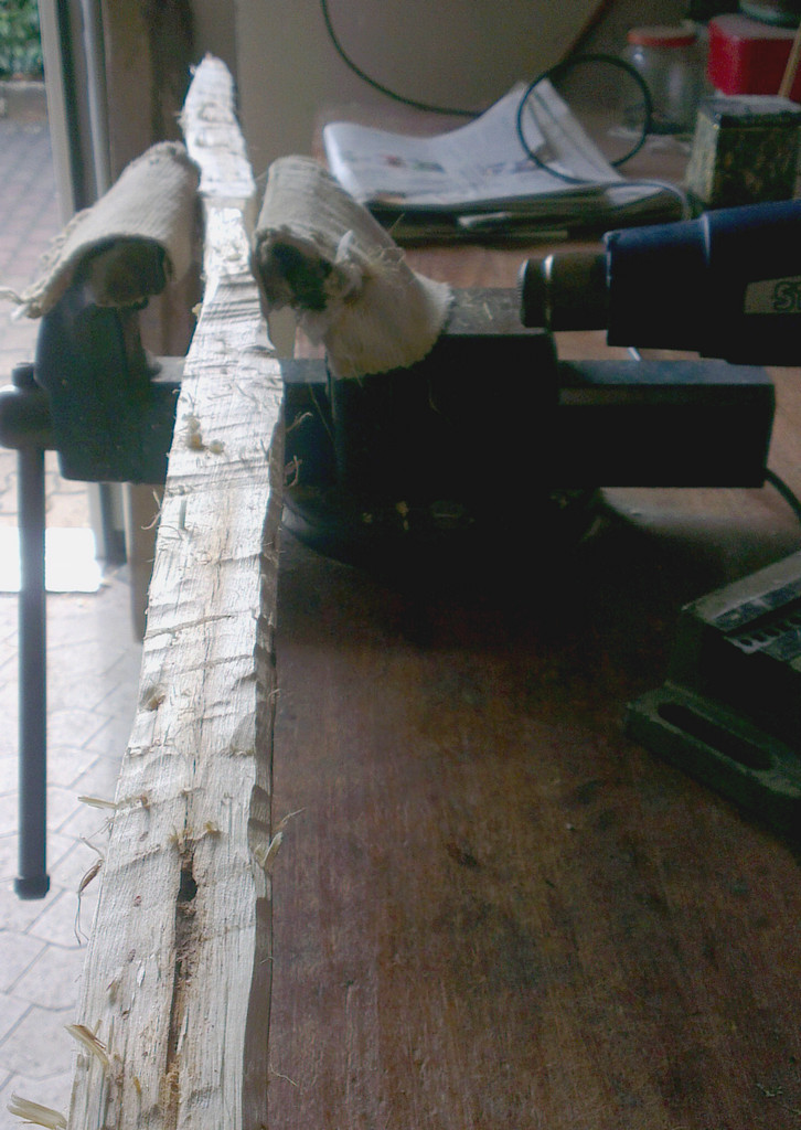 Der Holunderstamm ist was den Drehwuchs extrem. Ich hoffe das er hällt und das daraus ein Bogen werden will.