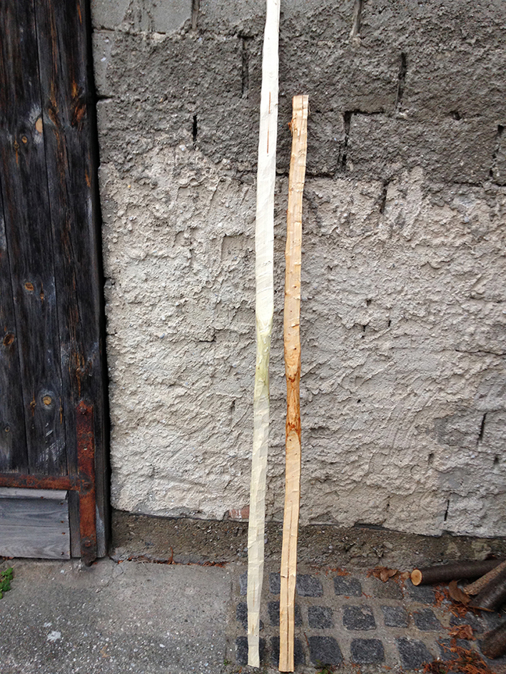 Also muss es Plan B werden. Der Haselstave. Der hat sich beim trocknen um ca. 45 Grad in Längsrichtung gedreht und im Griff geknickt. Die Drehung mit Dampf halbwegs rausbekommen und den Knick mittels wolfschem Keil behoben.