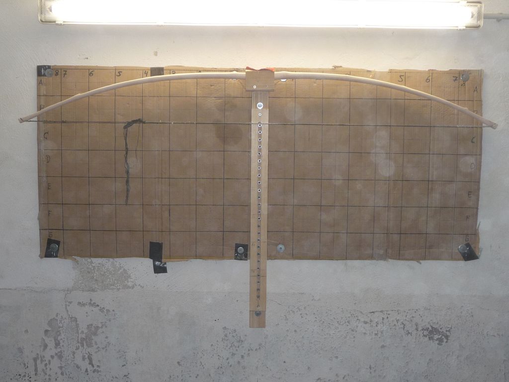 Das Tillern war nicht ganz einfach, da ich den großen Ast( links oberer Wurfarm) steif lassen musste und direkt dahinter war eine deflexe Stelle. Auf der rechten Seite(unterer Wurfarm) war direkt hinter dem Griff seitlich ein Ast, auch diesen musste ich steifer lassen. Obendrauf kam noch der Drehwuchs auf beiden Seiten. Nun ja ich hoffe der Tiller passt, bzw bei dem 27" tiller bin ich mir nicht sicher ob ich ihn so lassen sollte.