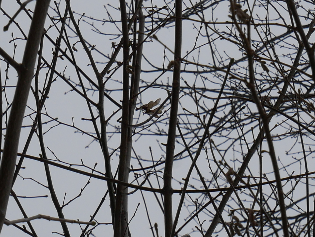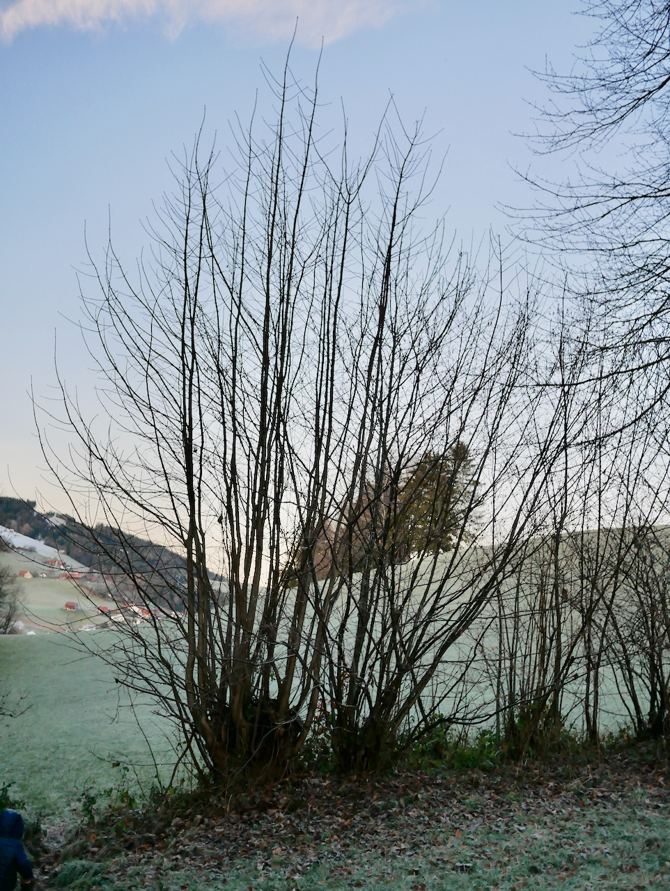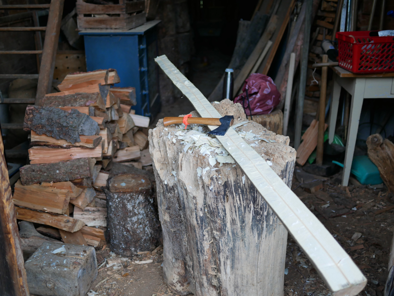 Auf den Markkanal herunter gearbeitet (Minibeil) Feierabend: Die provisorischen Dimensionen sind eingezeichnet, und der Spaltling zum Trocknen aufgehängt. Ich dachte eigentlich, es sei eine Esche, die ich hier gefällt habe. Aber dann kamen mir Zweifel: Esche hat schwarze Knospen, der hier nicht: Genaueres hinschauen am nächsten Tag hat ergeben dass es sich um einen Ahorn handeln muss: Ein totes Blatt am Boden hat den Verdacht dann bestätigt: Bergahorn. Ich habe noch nie mit Ahorn gearbeitet, alles was ich darüber weiss ist dass sich das Holz nicht gut für Hitzebehandlung eignen soll. Wer weiss mehr über Ahorn?