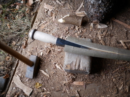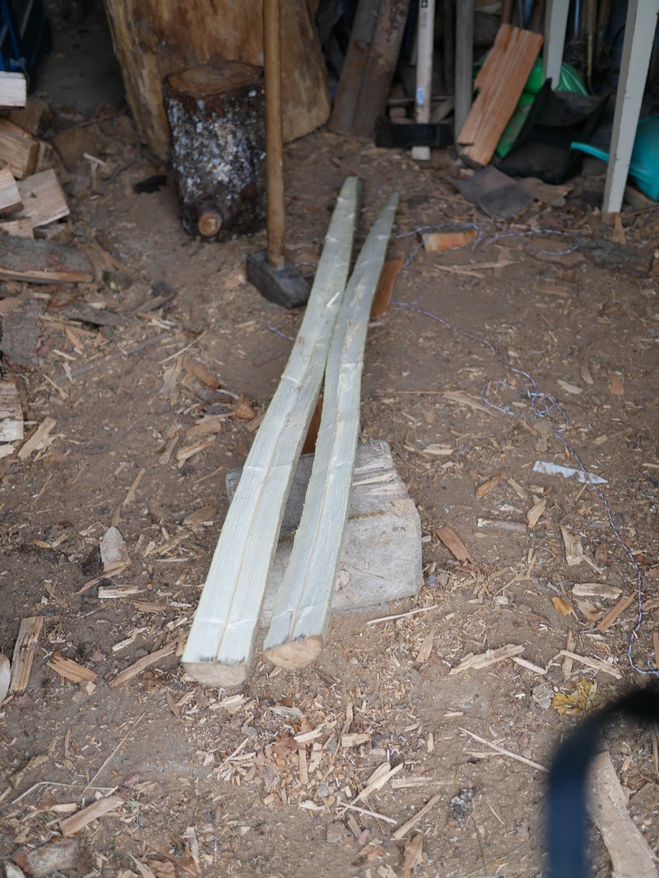Näher dran: Gefällt (Werkzeug: Minibeil) Spalten (Werkzeug: Keil, Spalthammer) Da ist mir schon der erste Anfängerfehler passiert: Anstatt vom dünnen Ende her zu spalten habe ich beim Dicken Ende begonnen. Dabei weiss ich vom Brennholz eigentlich dass man Holz immer "Wie der Vogel scheisst" also von der Krone zur Wurzel her spalten soll. Das gilt anscheinend auch für Bogenholz. Darum ist die Hälfte, die ich eigentlich wollte, zum Ende her ziemlich dünn geworden, wie man auf dem nächsten Bild sieht. Macht nichts, ich nehme die andere Hälfte. Diese ist im Griff Deflex, an den Enden leicht Reflex gebogen.