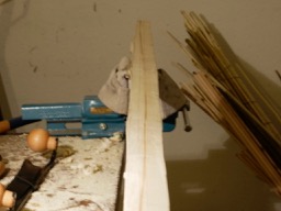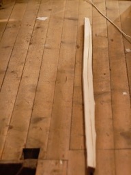 Den stave habe ich inzwischen oberflächlich entrindet und etwa auf mögliche Bogendimensionen heruntergearbeitet. Im Moment ist er aber noch bei 4.8cm in der Mitte und 3cm an den Tips, was mir noch zu breit ist. Damit habe ich aber noch etwas Spielraum um Überraschungen zu begegnen.