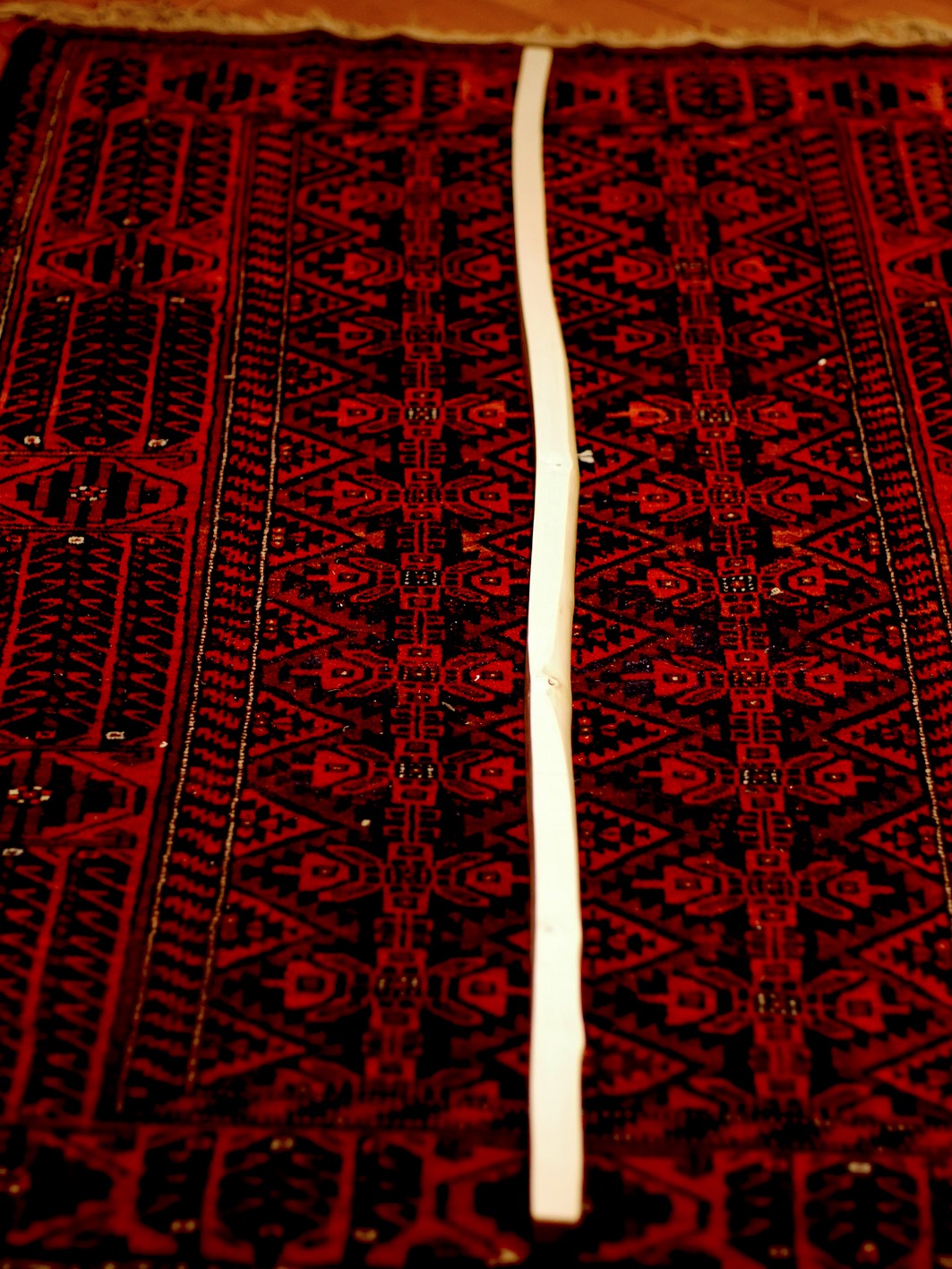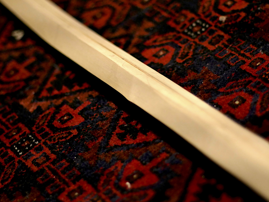 Hier zweimal von der Seite, man sieht etwas Deflex in der Bogenmitte und Reflex zum einen Ende hin. , Dann flach über den Bogenbauch gepeilt. Die Tips werden noch dünner. Wie ich die Äste umgangen bin sieht man gut. Meine Sorgenstelle: die Bogenmitte. Wie auch auf den Bildern oben sichtbar gibt es da ein verstecktes Ästchen von ca 4mm Durchmesser. Weil es genau in der Mitte ist habe ich die Breite deswegen nicht angepasst, werde aber an dieser Stelle den Bogen etwas steifer machen. Muss ich da Epoxy reinfüllen?