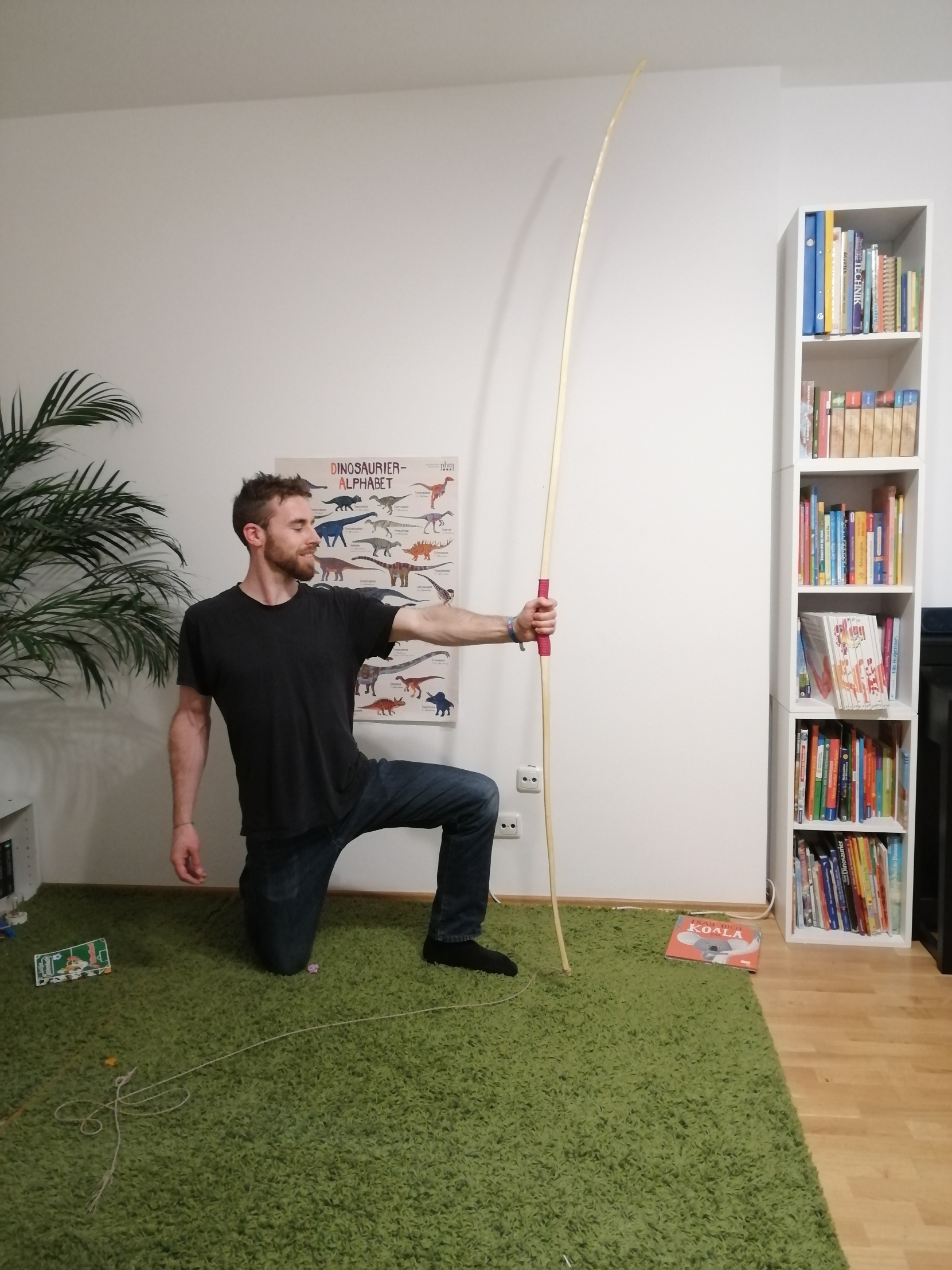 Die Inspiration zu diesem Bogen waren die Oberflacht-Bogen. Der Griff biegt bei dem hier etwas mit, ganz steif ging aufgrund der Saplingdicke nicht. Aber egal.