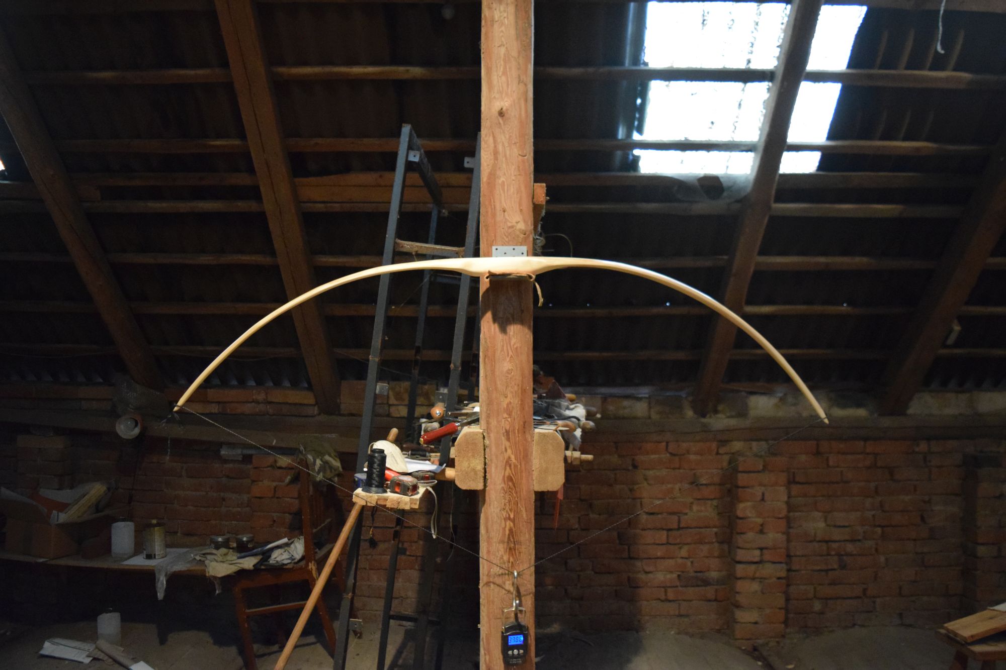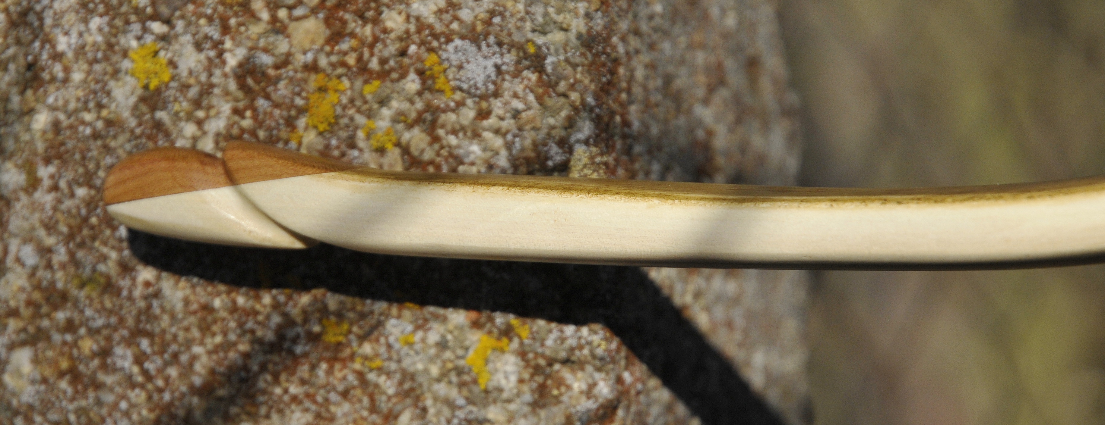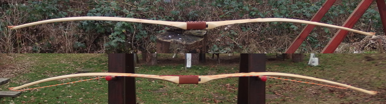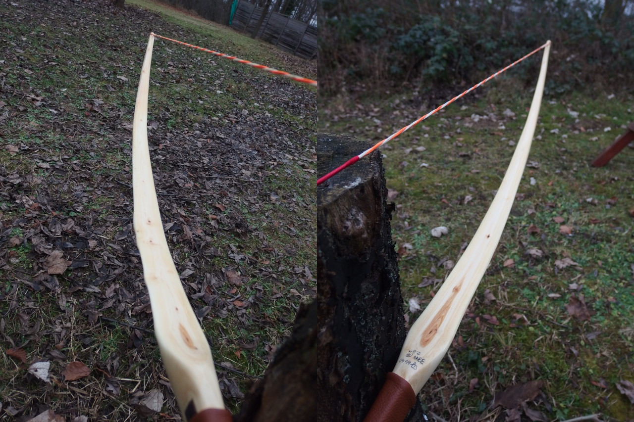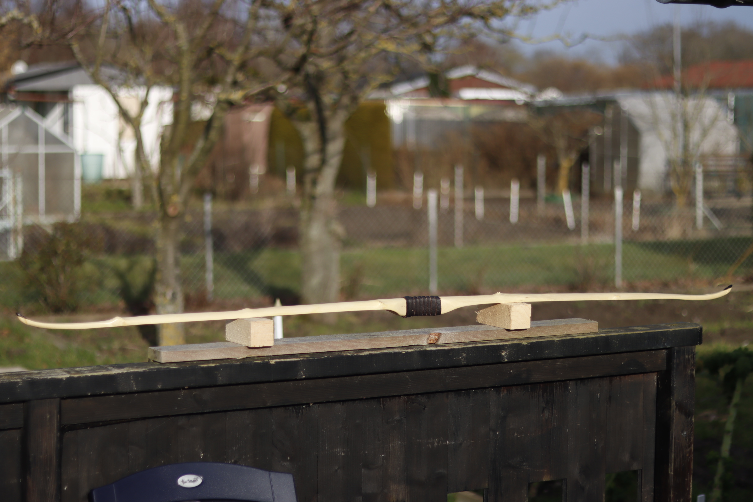 Besteht fast nur aus Splint, deflexe Biegung in beiden Wurfarmen gewachsen mit reflex ab Griff (Möwenform oder wie man das nennt). Holz hat Stringfollow, Set aber kaum. Finish Leinölfirnis / Hartöl. Arrowpass aus Wasserbüffelhorn, Griff aus Leder, Tip-Overlays aus Kirschkernholz. Sehnenlänge 1,59m, Standhöhe 15,5cm. Sehne 10 Strang B55. Breite nach Fadeout 42mm, vor Sehnenkerben an Tips knapp 11mm. Design vollpyramidal nach Augenmaß.