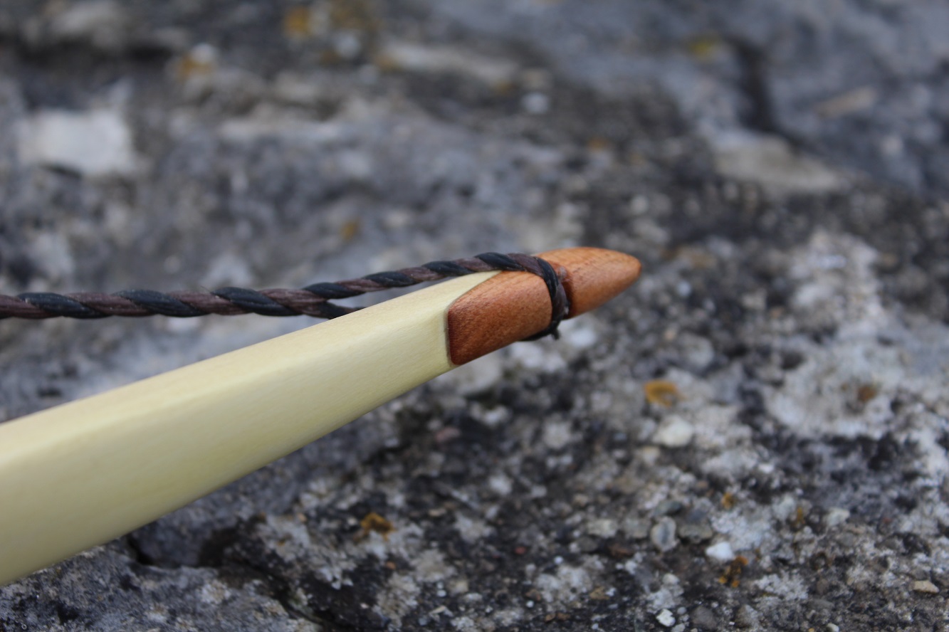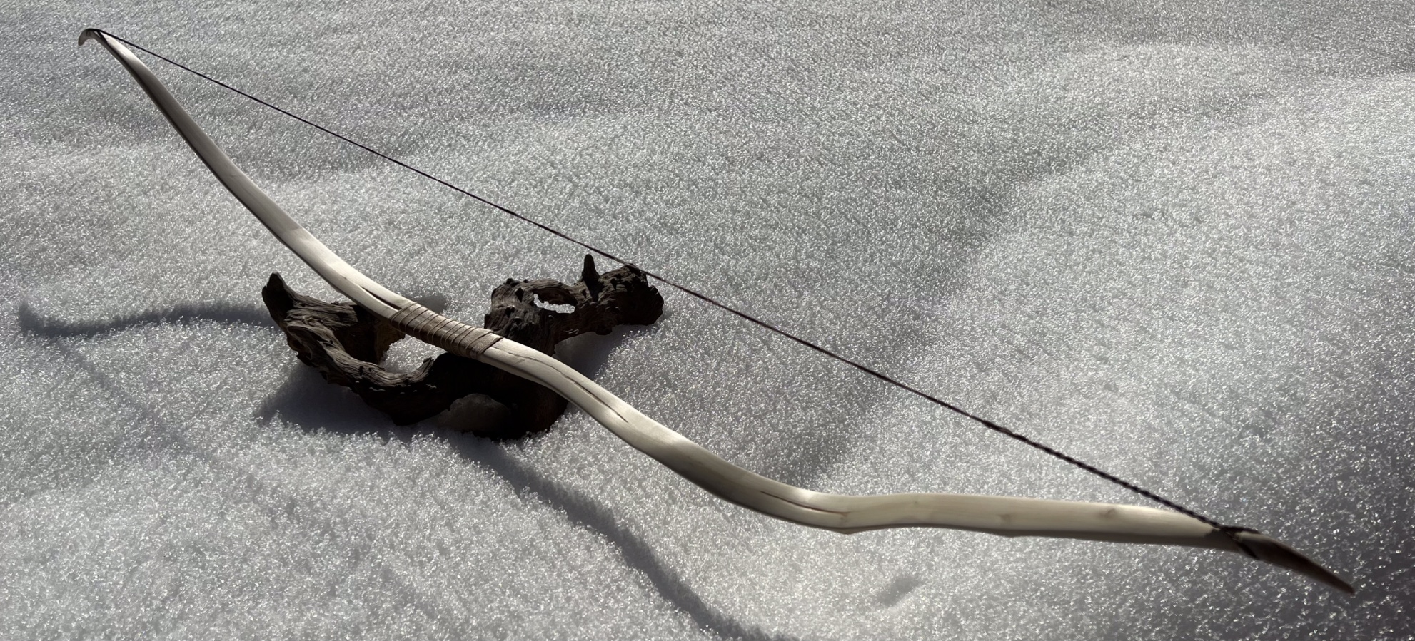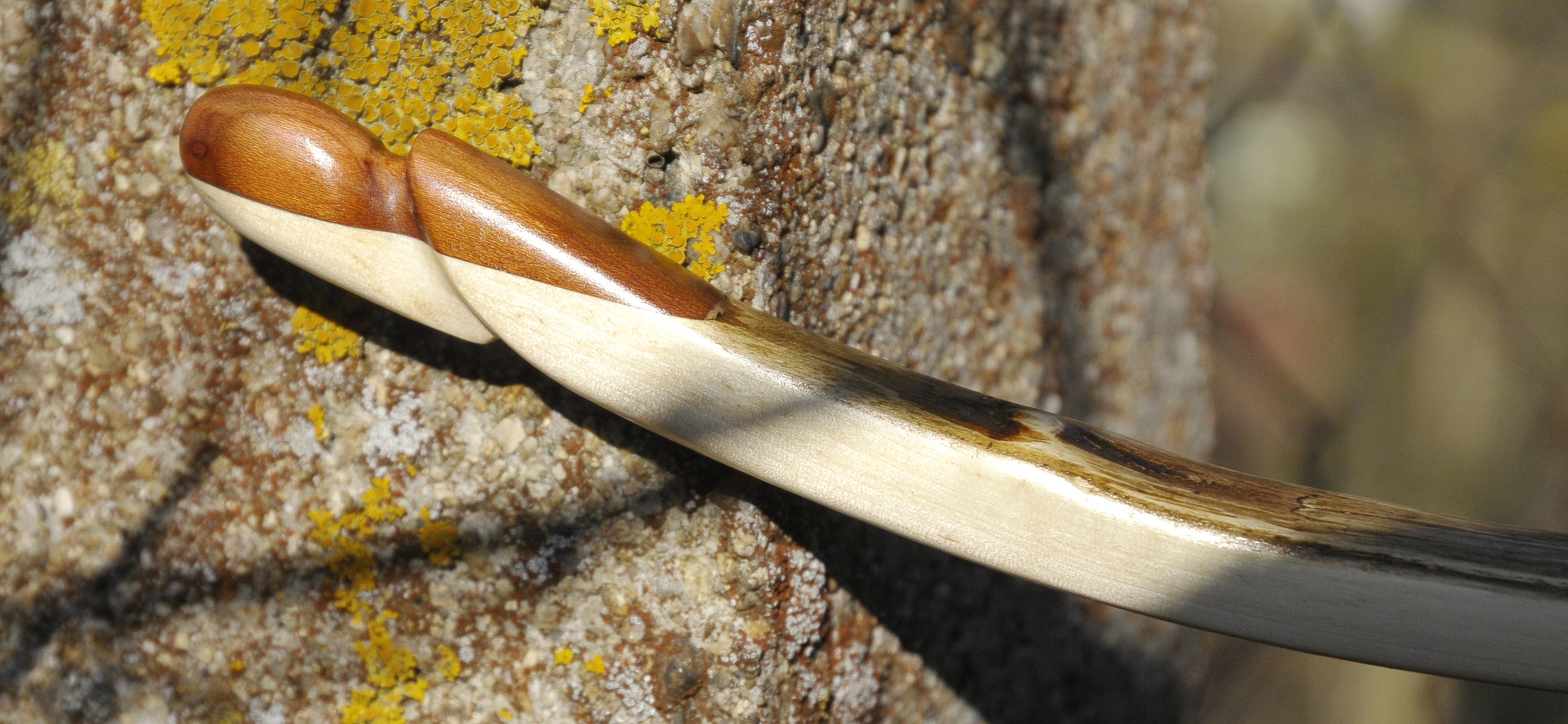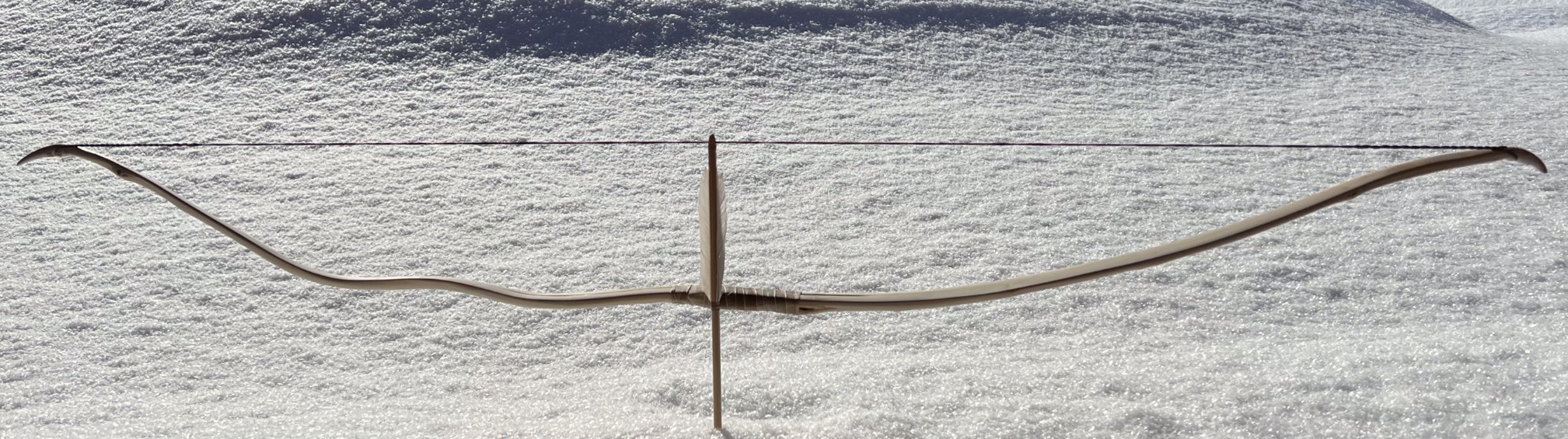 Besteht fast nur aus Splint, deflexe Biegung in beiden Wurfarmen gewachsen mit reflex ab Griff (Möwenform oder wie man das nennt). Holz hat Stringfollow, Set aber kaum. Finish Leinölfirnis / Hartöl. Arrowpass aus Wasserbüffelhorn, Griff aus Leder, Tip-Overlays aus Kirschkernholz. Sehnenlänge 1,59m, Standhöhe 15,5cm. Sehne 10 Strang B55. Breite nach Fadeout 42mm, vor Sehnenkerben an Tips knapp 11mm. Design vollpyramidal nach Augenmaß.