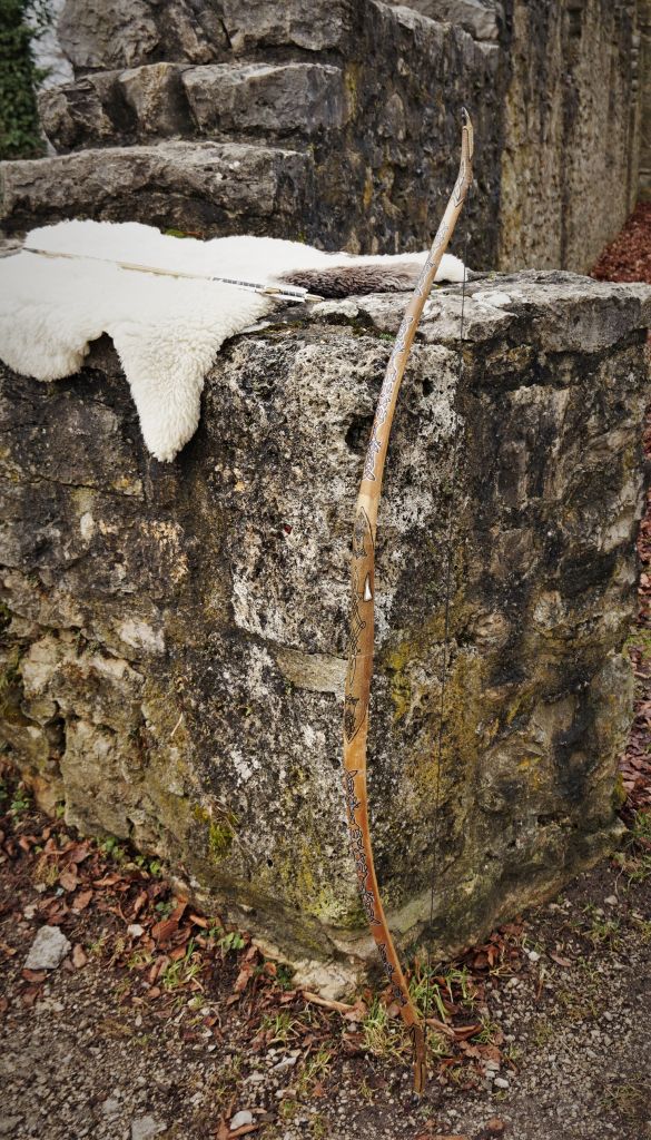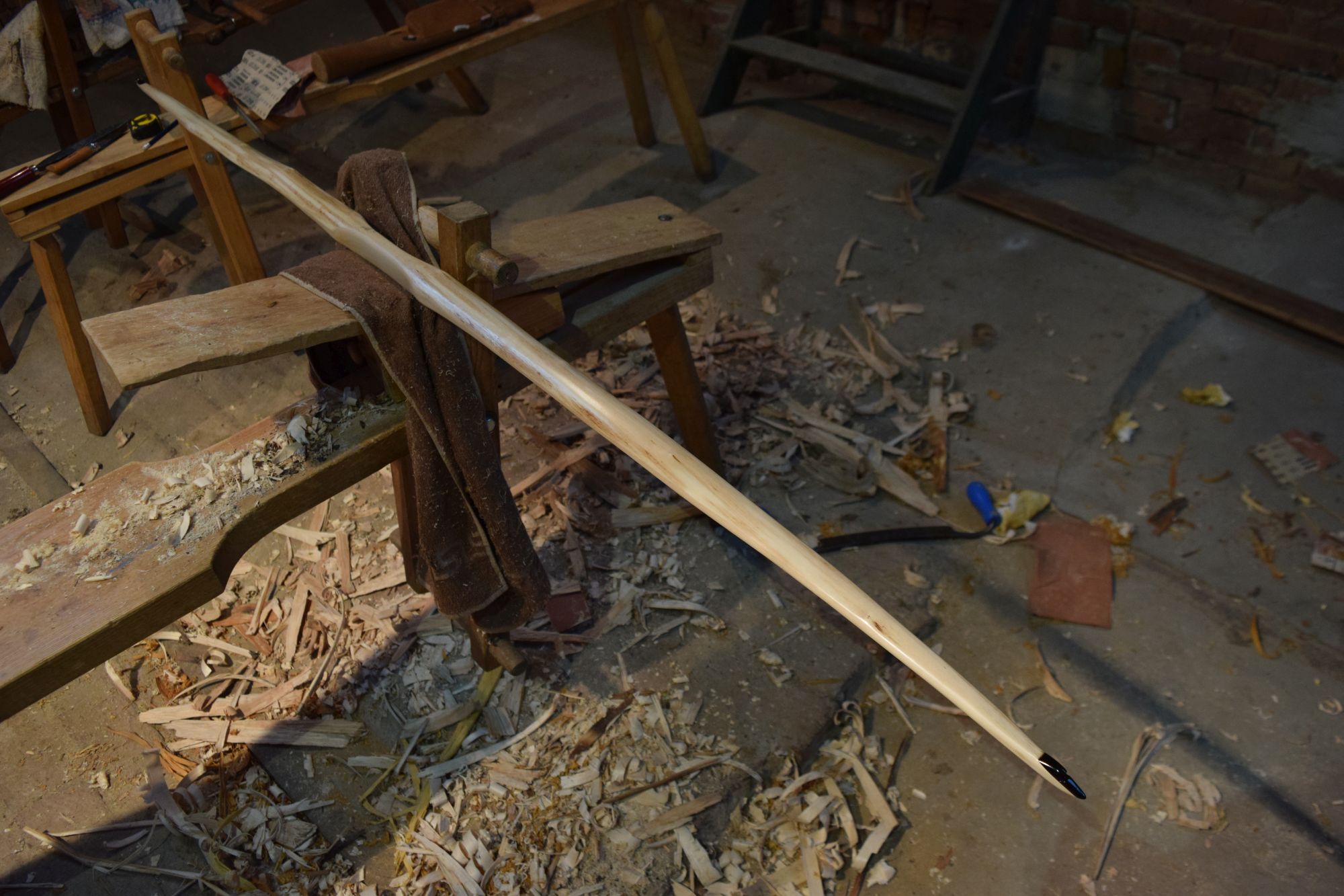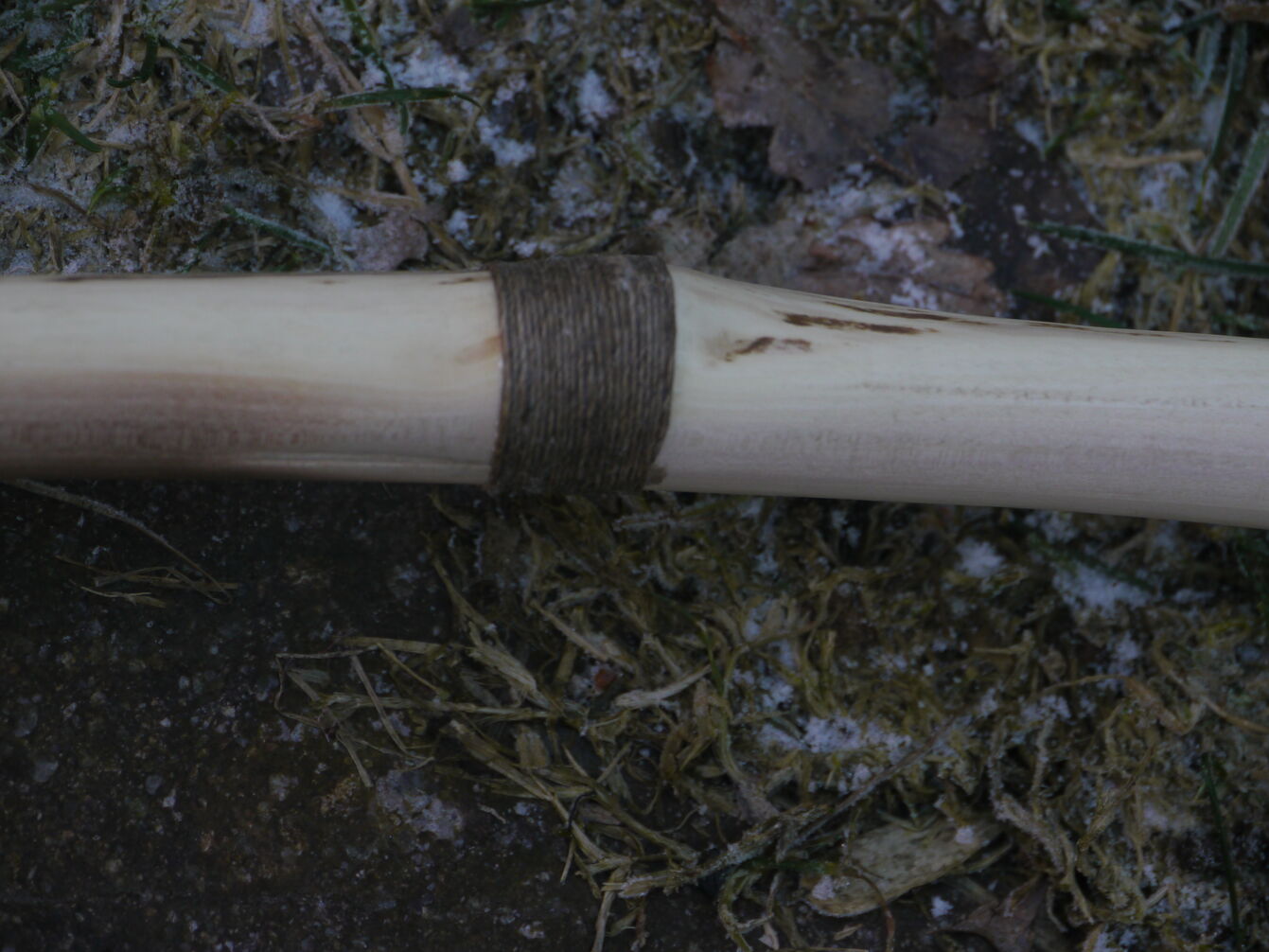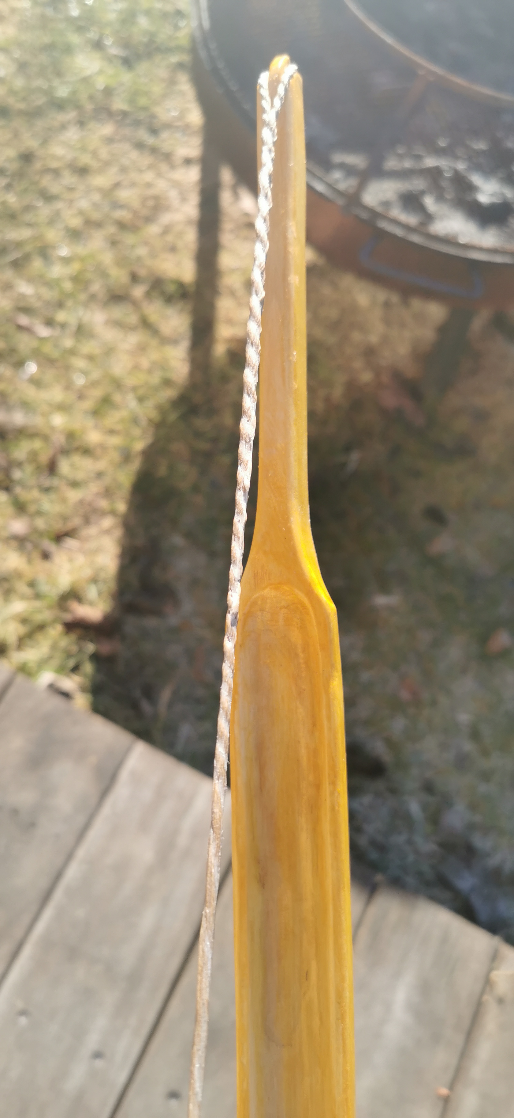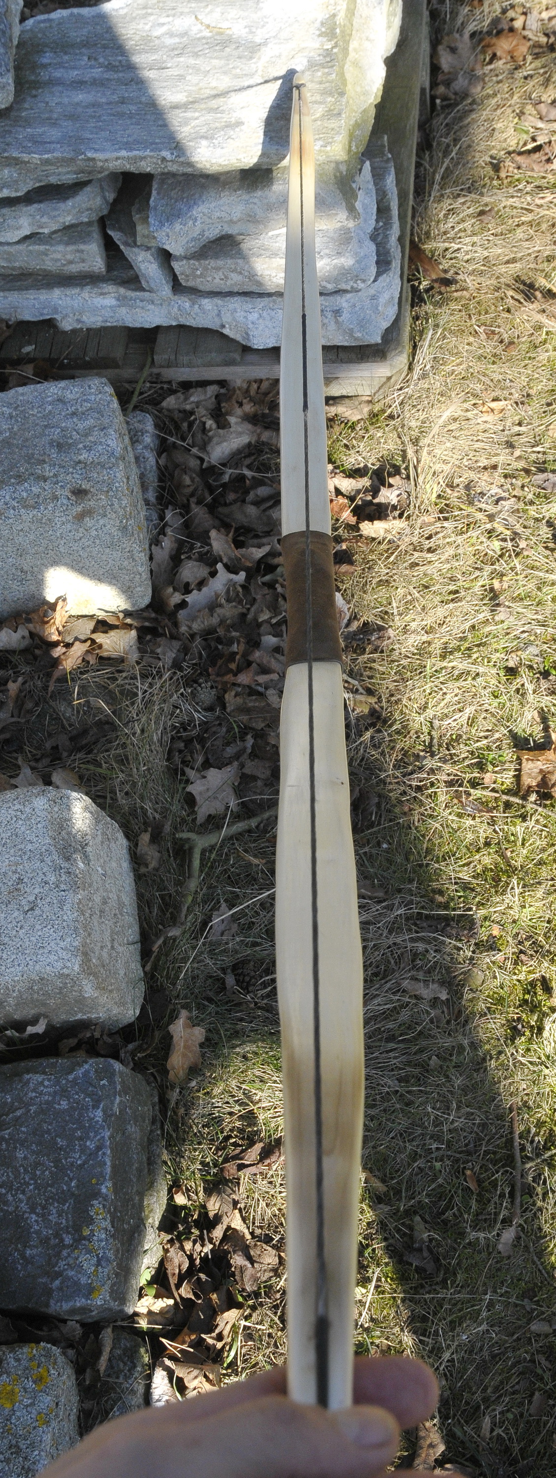 Besteht fast nur aus Splint, deflexe Biegung in beiden Wurfarmen gewachsen mit reflex ab Griff (Möwenform oder wie man das nennt). Holz hat Stringfollow, Set aber kaum. Finish Leinölfirnis / Hartöl. Arrowpass aus Wasserbüffelhorn, Griff aus Leder, Tip-Overlays aus Kirschkernholz. Sehnenlänge 1,59m, Standhöhe 15,5cm. Sehne 10 Strang B55. Breite nach Fadeout 42mm, vor Sehnenkerben an Tips knapp 11mm. Design vollpyramidal nach Augenmaß.