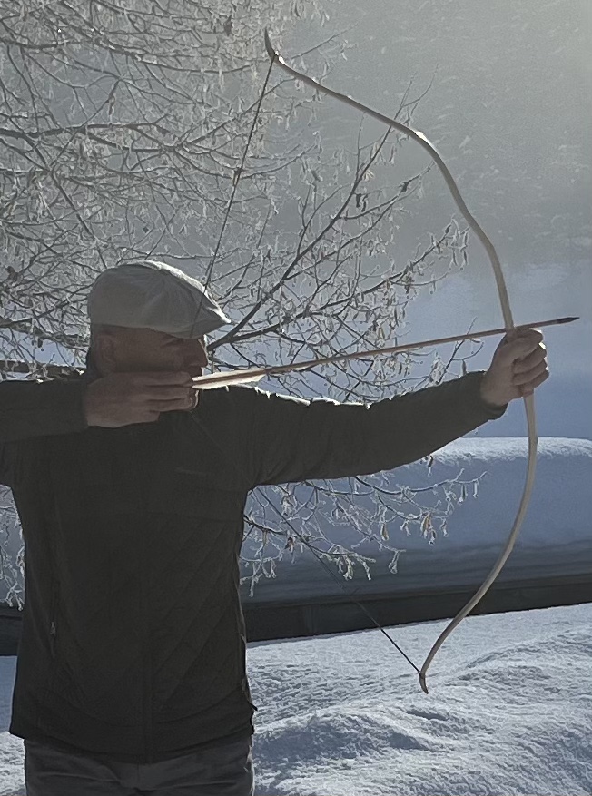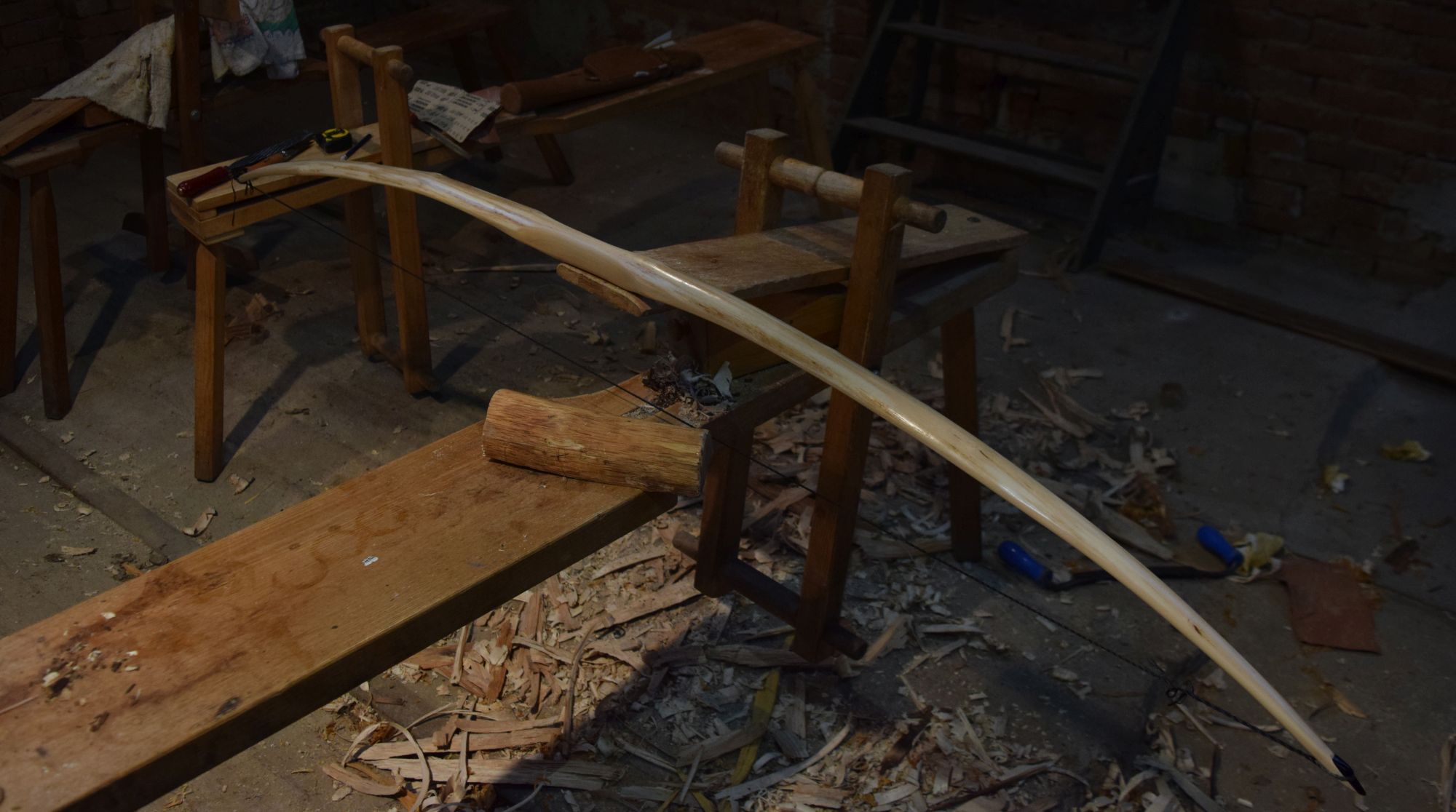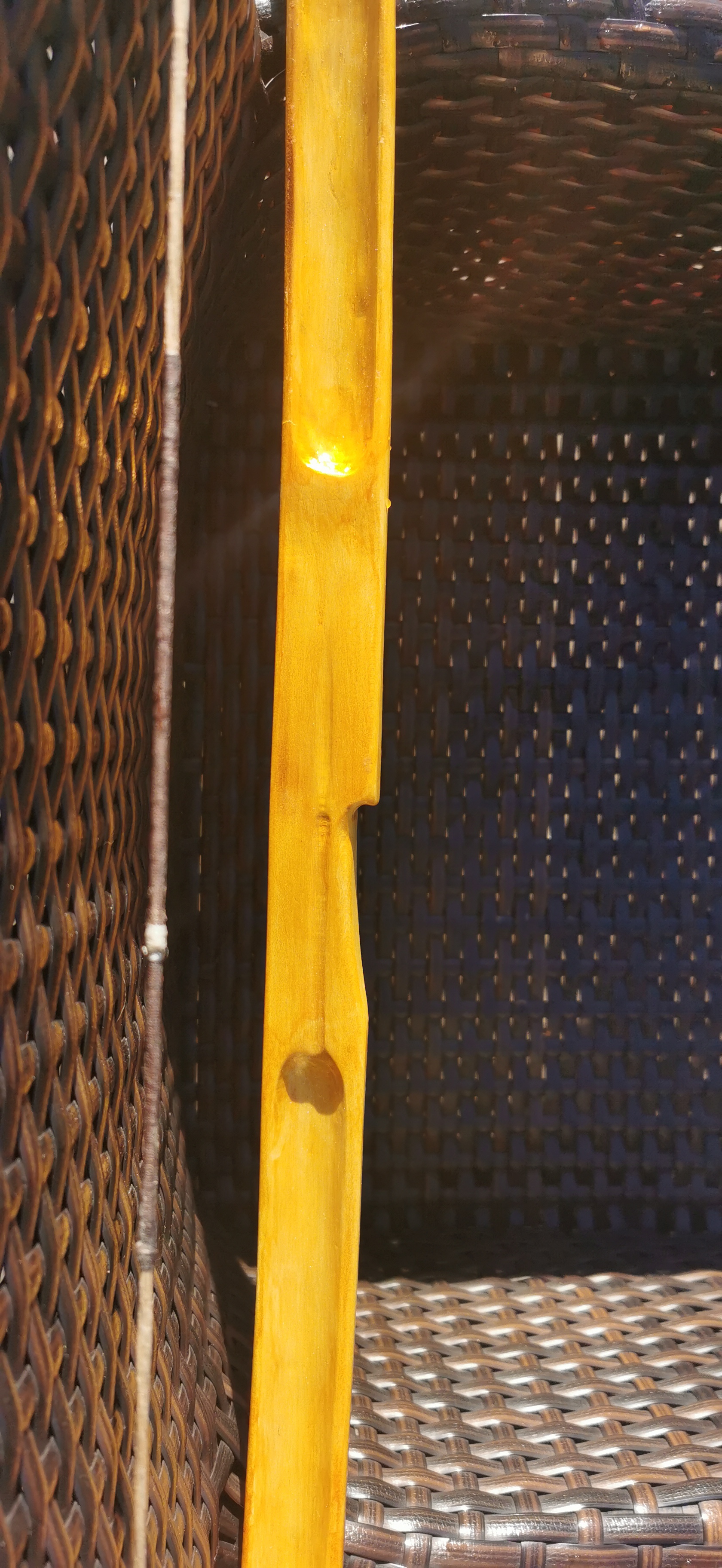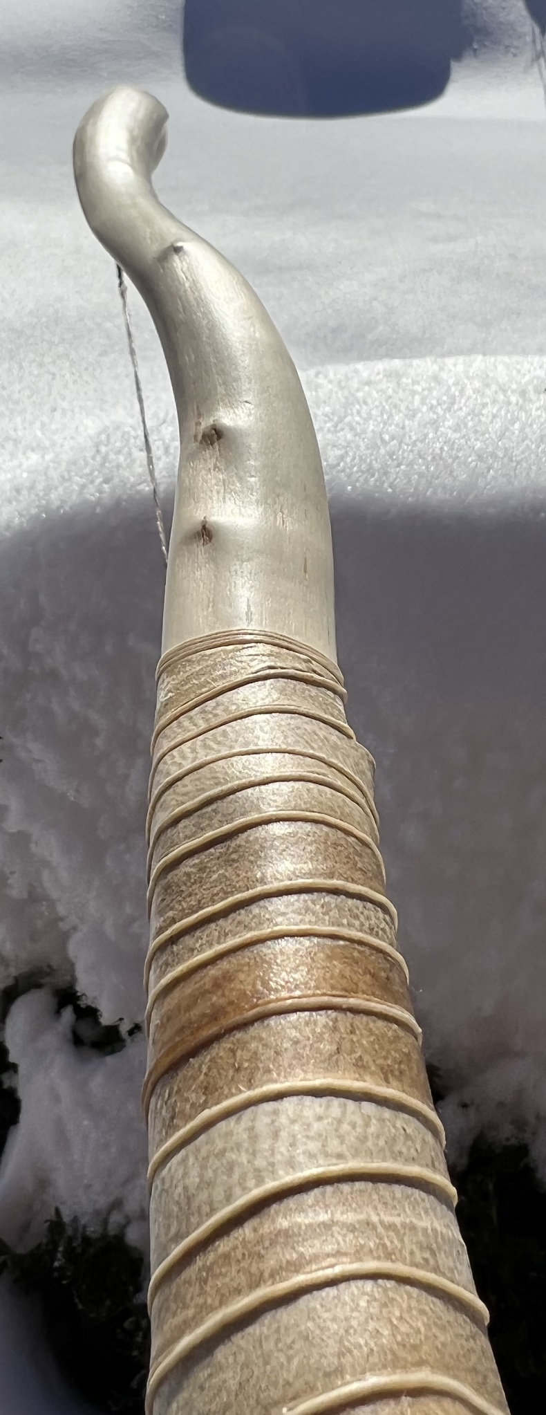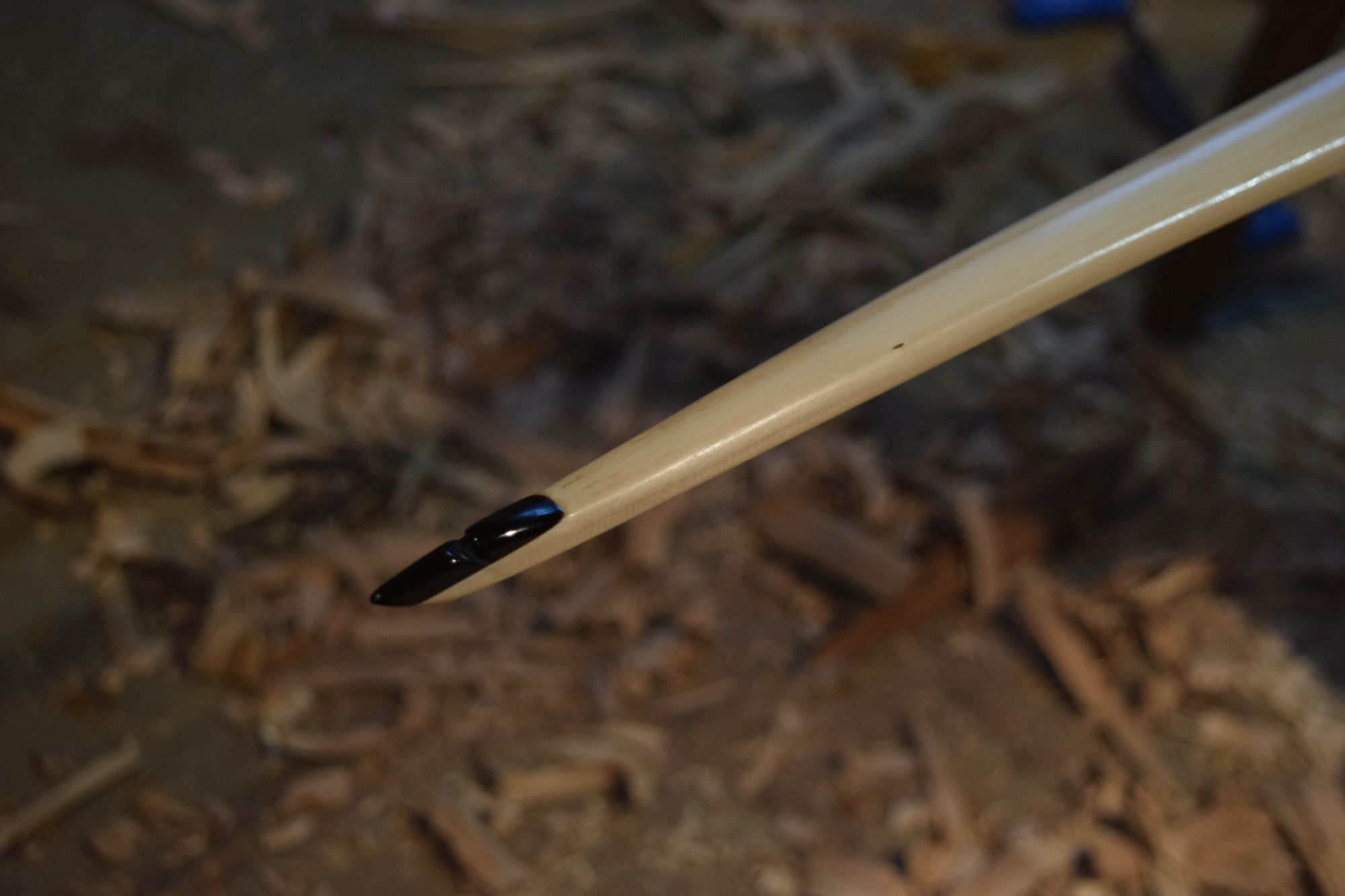 Besteht fast nur aus Splint, deflexe Biegung in beiden Wurfarmen gewachsen mit reflex ab Griff (Möwenform oder wie man das nennt). Holz hat Stringfollow, Set aber kaum. Finish Leinölfirnis / Hartöl. Arrowpass aus Wasserbüffelhorn, Griff aus Leder, Tip-Overlays aus Kirschkernholz. Sehnenlänge 1,59m, Standhöhe 15,5cm. Sehne 10 Strang B55. Breite nach Fadeout 42mm, vor Sehnenkerben an Tips knapp 11mm. Design vollpyramidal nach Augenmaß.