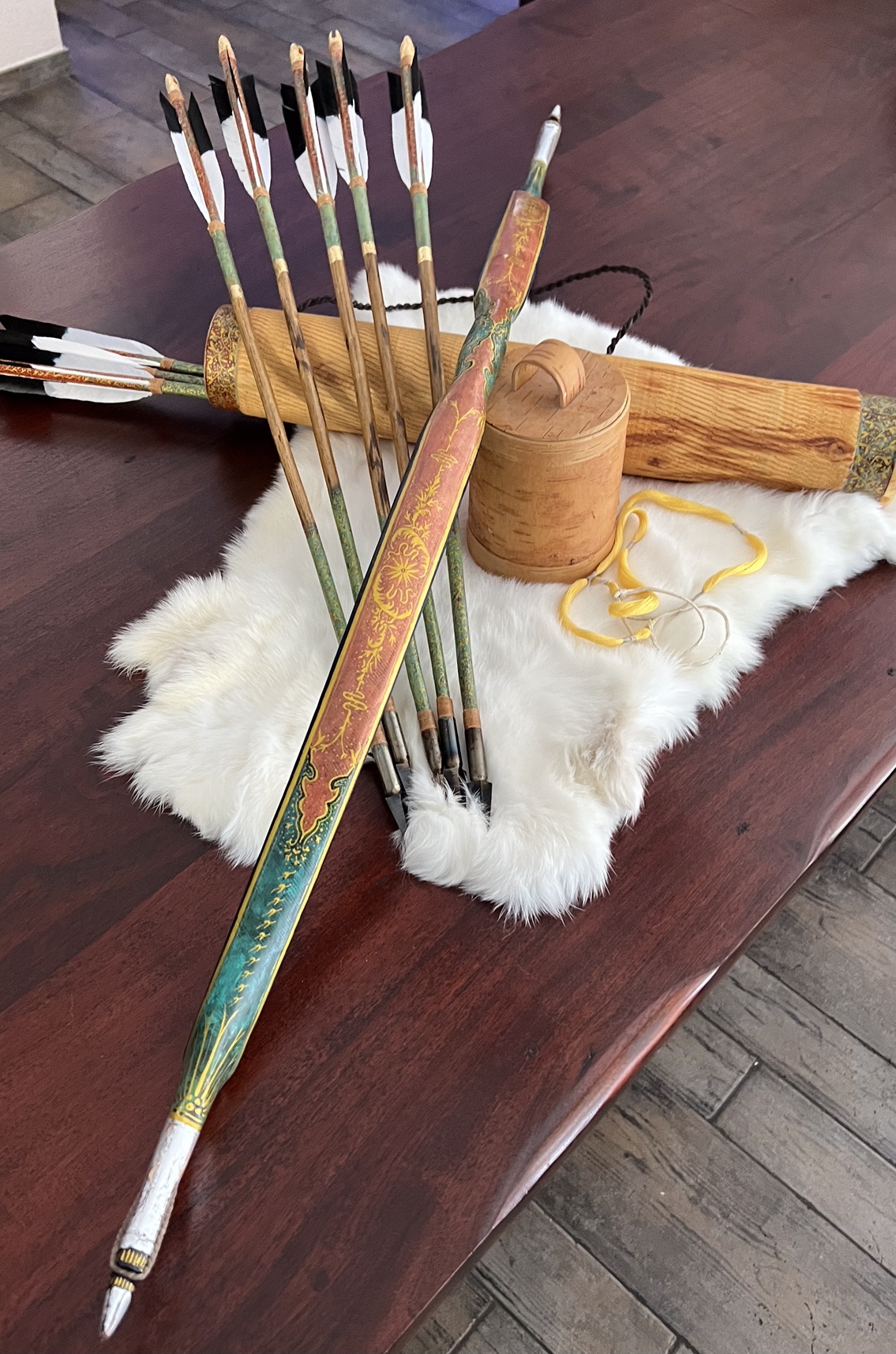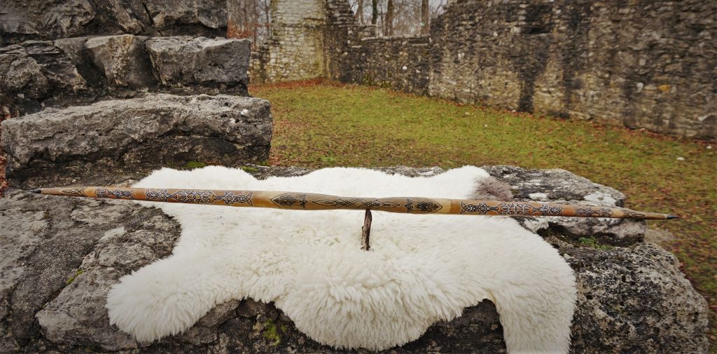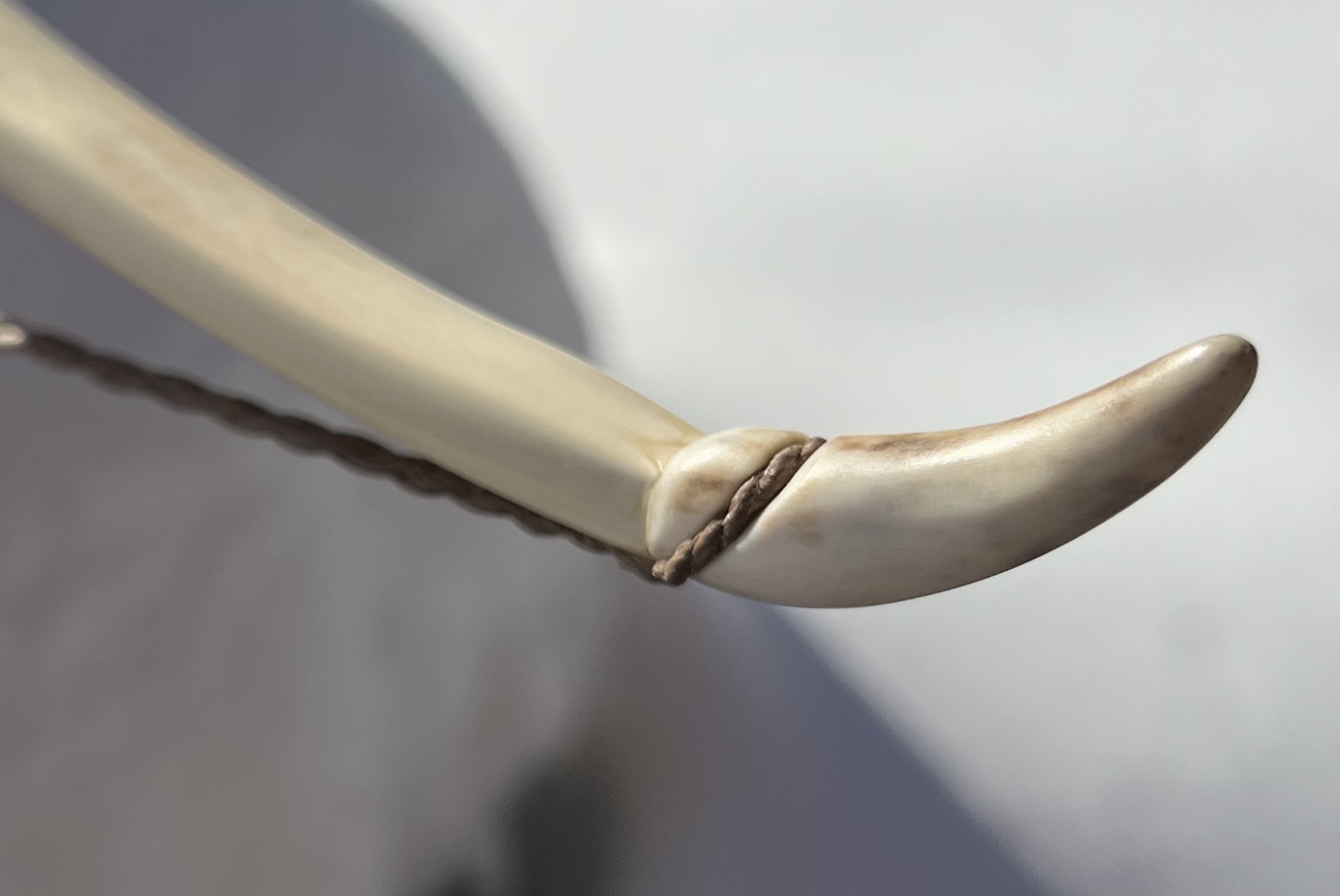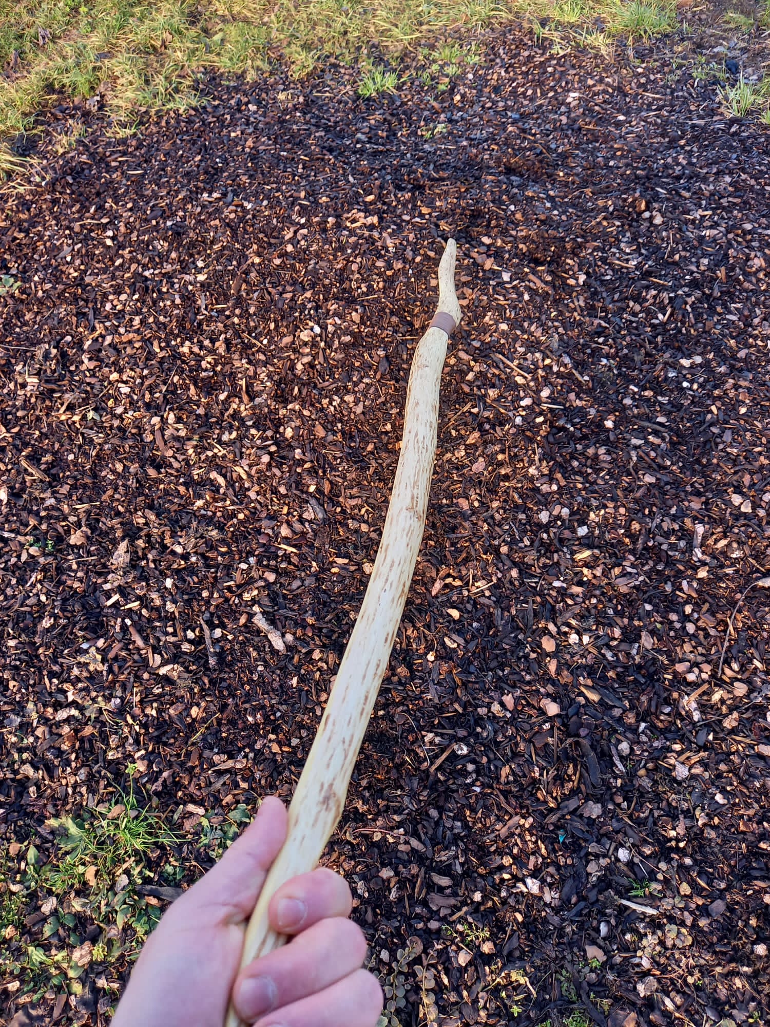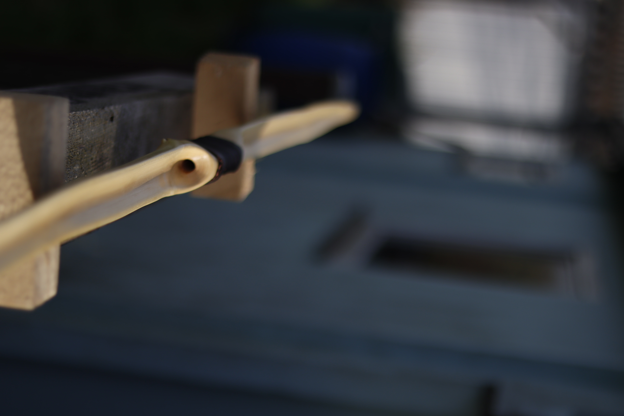 Besteht fast nur aus Splint, deflexe Biegung in beiden Wurfarmen gewachsen mit reflex ab Griff (Möwenform oder wie man das nennt). Holz hat Stringfollow, Set aber kaum. Finish Leinölfirnis / Hartöl. Arrowpass aus Wasserbüffelhorn, Griff aus Leder, Tip-Overlays aus Kirschkernholz. Sehnenlänge 1,59m, Standhöhe 15,5cm. Sehne 10 Strang B55. Breite nach Fadeout 42mm, vor Sehnenkerben an Tips knapp 11mm. Design vollpyramidal nach Augenmaß.