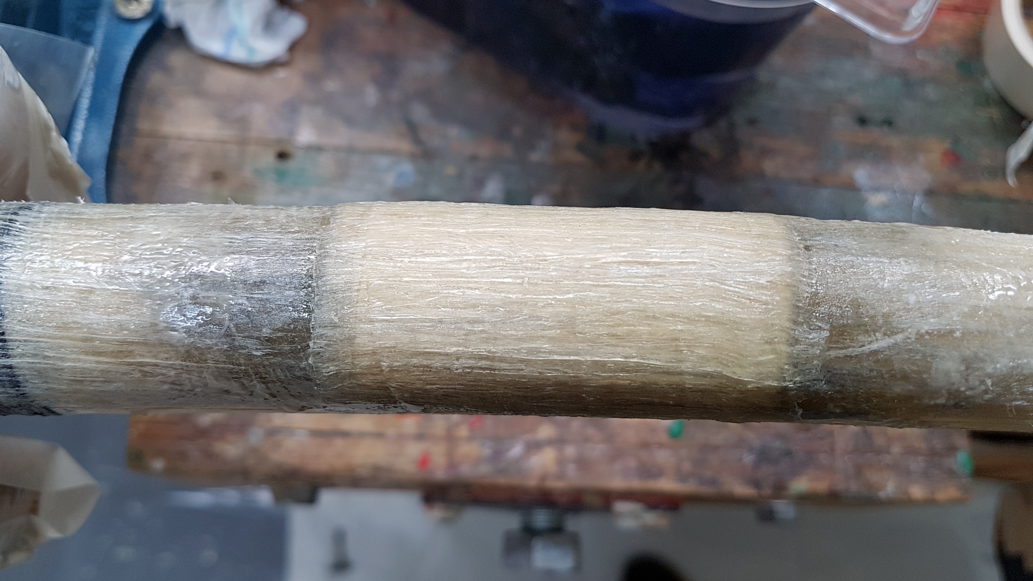 Außerdem gab es noch ein sehr dünnes Hornpatch über die Bruchstelle am Bauch (Foto vergessen). Da ich nicht lange warten wollte, habe ich meinen Heizlüfter auf die Stelle pusten lassen, so dass der Bauch auf ca. 90° C erhitzt wurde. Das Epoxid ist dann nach 20 Min. ausgehärtet. Allerdings war das ein Spiel mit dem Feuer, bei 56° C rückenseitig habe ich den Lüfter abgeschaltet und das Konstrukt wieder runter gekühlt.