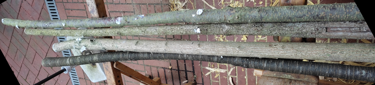 Als drittes und höchstwahrscheinlich für später eine Wildkirsche, die auf dem Weg zum Hartriegel mir zufällig begegnete. Der dicke Brocken links ist eigentlich besser, aber zu massiv. Der Ast rechts hat eine reflex/deflex Form, aber passende Dicke. Kernholz ist farblich noch nicht so zu sehen, mal gucken.