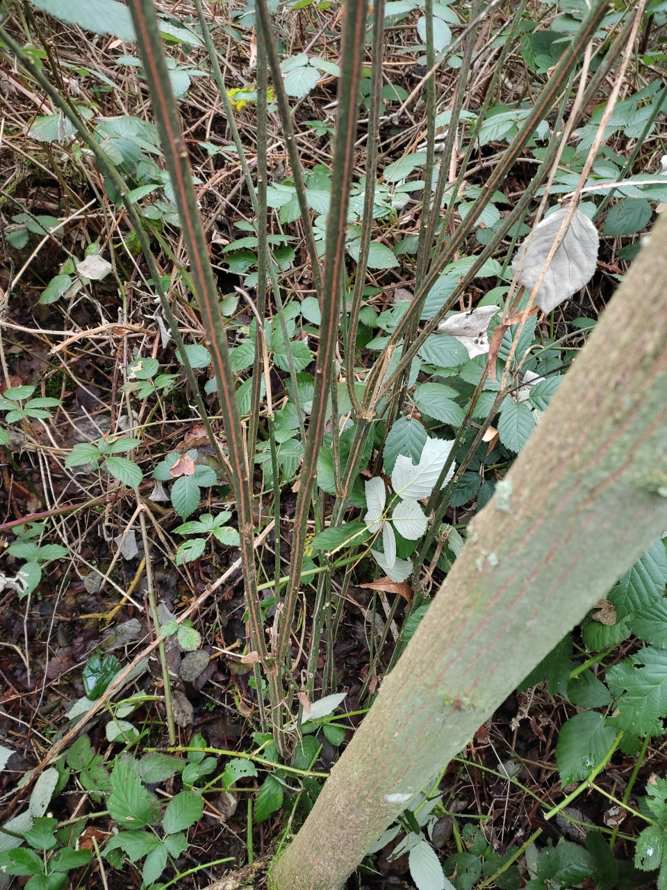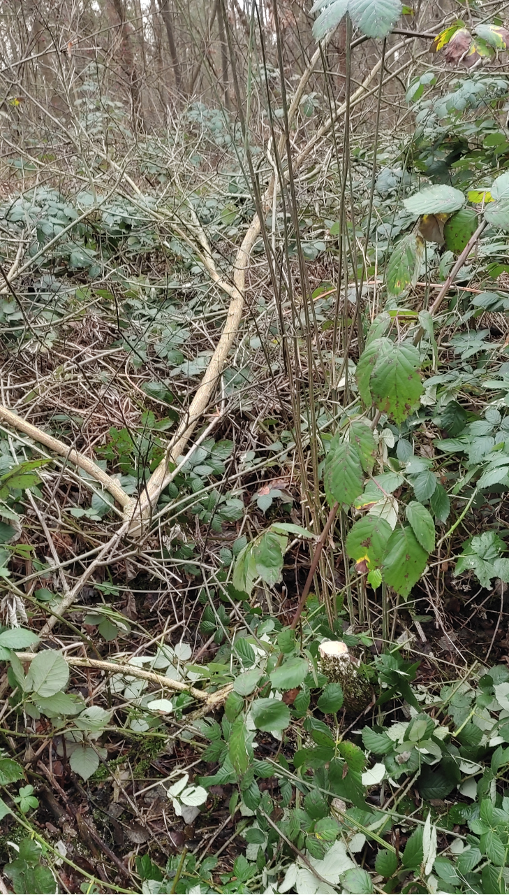 Und als viertes ein Pfaffenhütchen. Das ist der zweite Ast des Baumes, den ich letztes Jahr für das Sap-Turnier abgesägt habe. Der ist leider von der nutzbaren Länge sehr grenzwertig (140cm, mit reflexem Teil 160cm), aber man könnte Billets gewinnen (Dicke mit knapp über 5cm auch nicht gerade viel). Plan: Spalten versuchen für Billets, zur Not wirds halt ein kurzer Bogen. Hier ist der Erfolg sehr ungewiß, den werde ich wahrscheinlich später in Ruhe probieren. Die Pflanze überlebte meine Attacke vom letzten Jahr und bildete eine Menge Wassertriebe aus dem Stumpf. Alles in einem fiesen Brombeer-Gestrüpp. Freut mich, wenn der Baum es überlebt, ganz nach dem Motto von frankster.