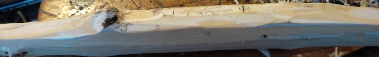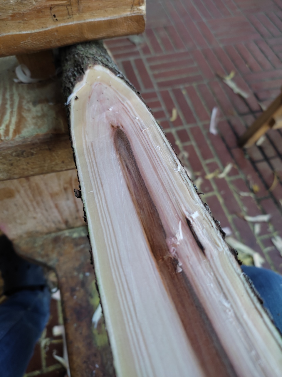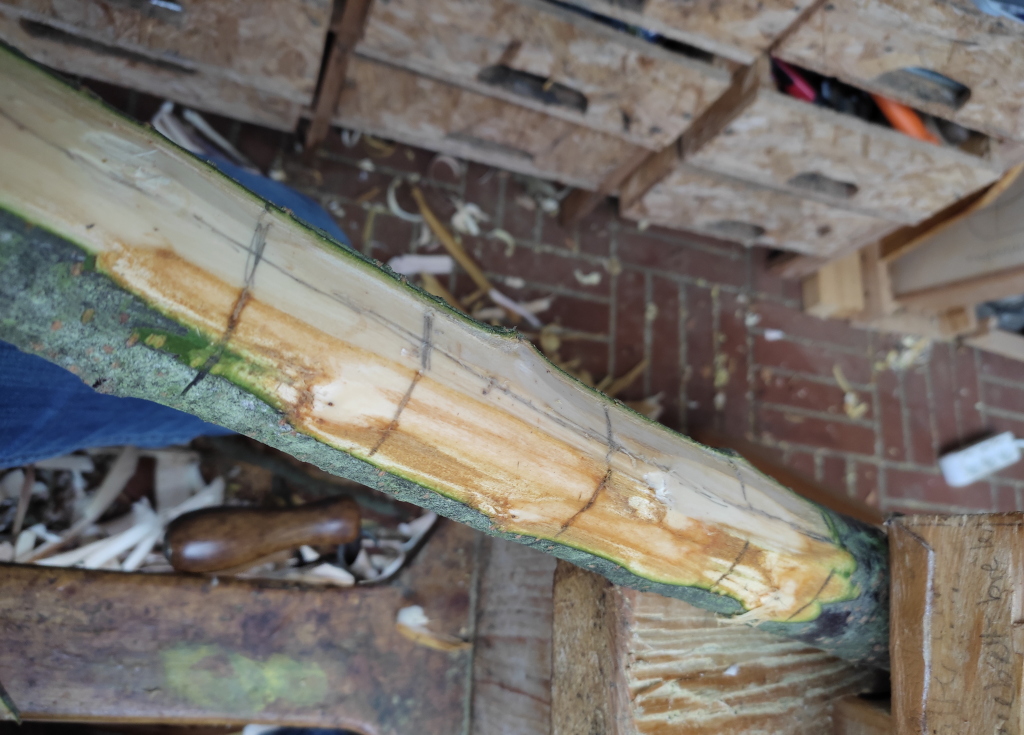 Dann mit dem Ziehmesser auf den Markkanal runterarbeiten, dickere Äste mit der Axt ausgeholfen (leider kein Bild). Oben ist der Markkanal verfärbt, das Holz aber fest: