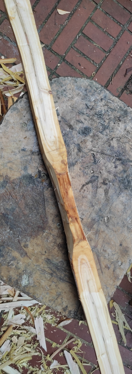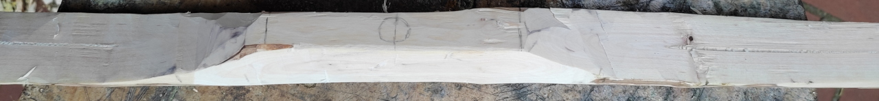 Also was tun, Reststück grob auf rechteckige, eher schmale Form bringen (Stabbogen). Geht im Wesentlichen schon noch, hat an einem Ende aber krass seitliche Biegung. Habe es dann zum Trocknen mit viel Zwingen und Kraft an eine Bohle gezwungen (ohne Hitze behandelt). Gebe dem keine große Chance. Vielleicht hätte ich noch Hitze ausprobieren sollen (Dampf).