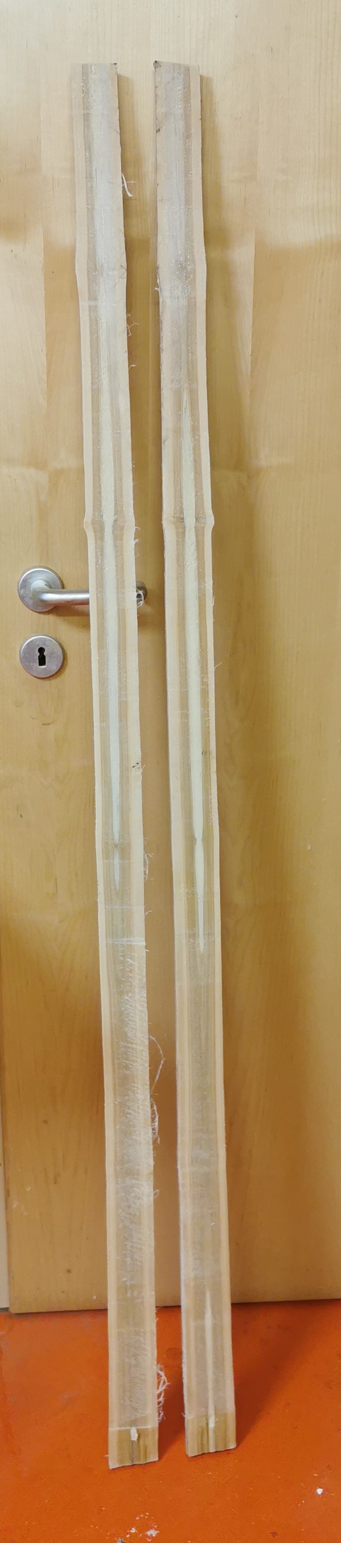 Heute habe ich am Stabbogen in spe wieder Material abgetragen, an der dicksten Stelle in der Mitte hat er jetzt noch 25mm, und wiegt noch 511g, bei der leichten Verdrehung ist es geblieben, und er ist immer noch kerzengerade. Ob das mit den 50-60# was wird, keine Ahnung, wirkt momentan noch etwas weich, ist aber auch noch nicht trocken.