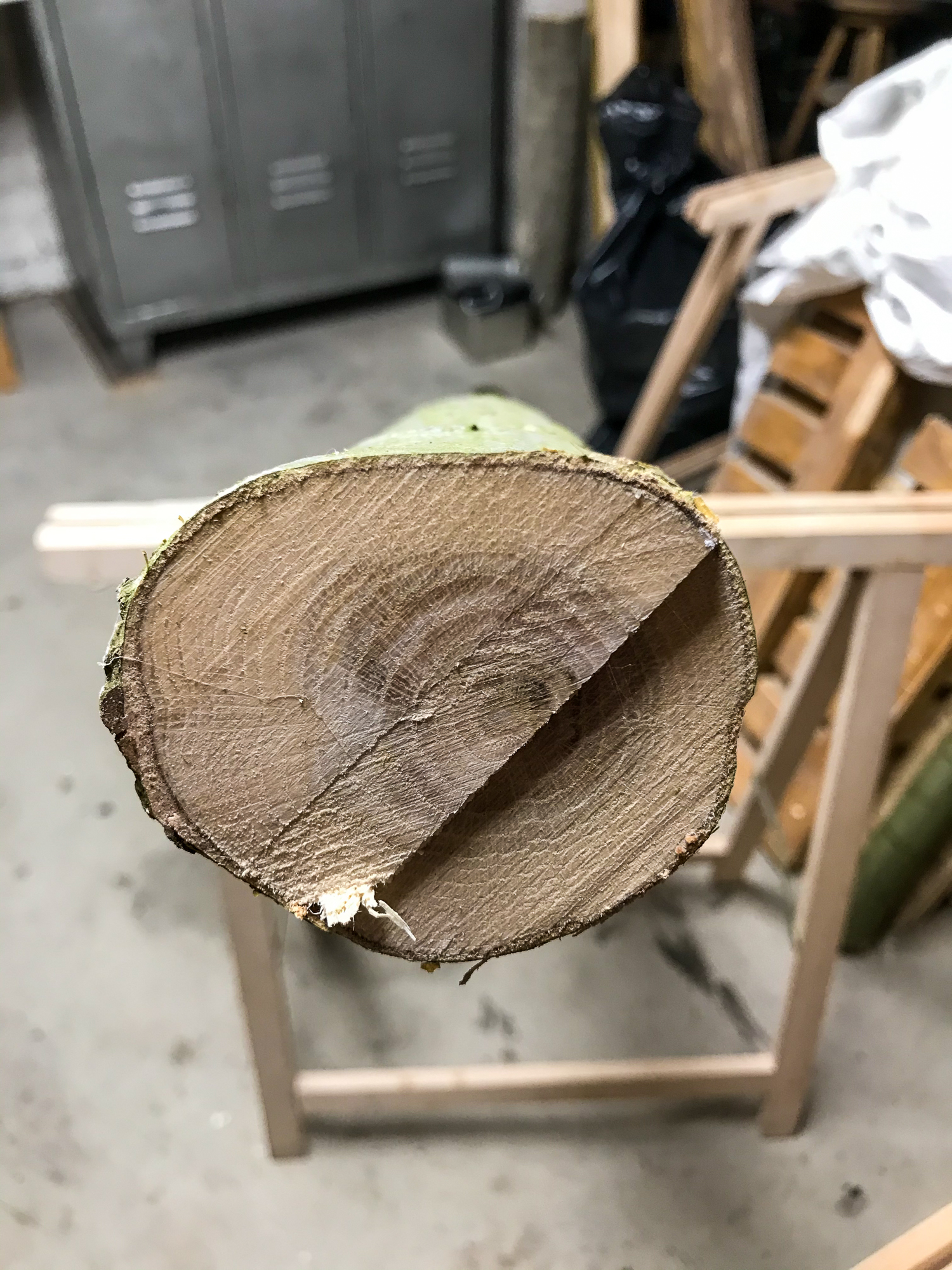Da ich keine Bandsäge habe und Roteiche sehr einfach zu spalten sein soll, habe ich mir überlegt die Wurfarme wegzuspalten. Vom Griff will ich erstmal so viel wie möglich stehen lassen. Hat auch super geklappt. Rinde soweit runter, dass der erwartete Verlauf des Spalts gut zu sehen und zu kontrollieren ist und dann 15 cm vor dem Fade eine Markierung bei der ich den abgespaltenen Teil absägen kann. Hauptsache der Spalt läuft nicht zu weit!