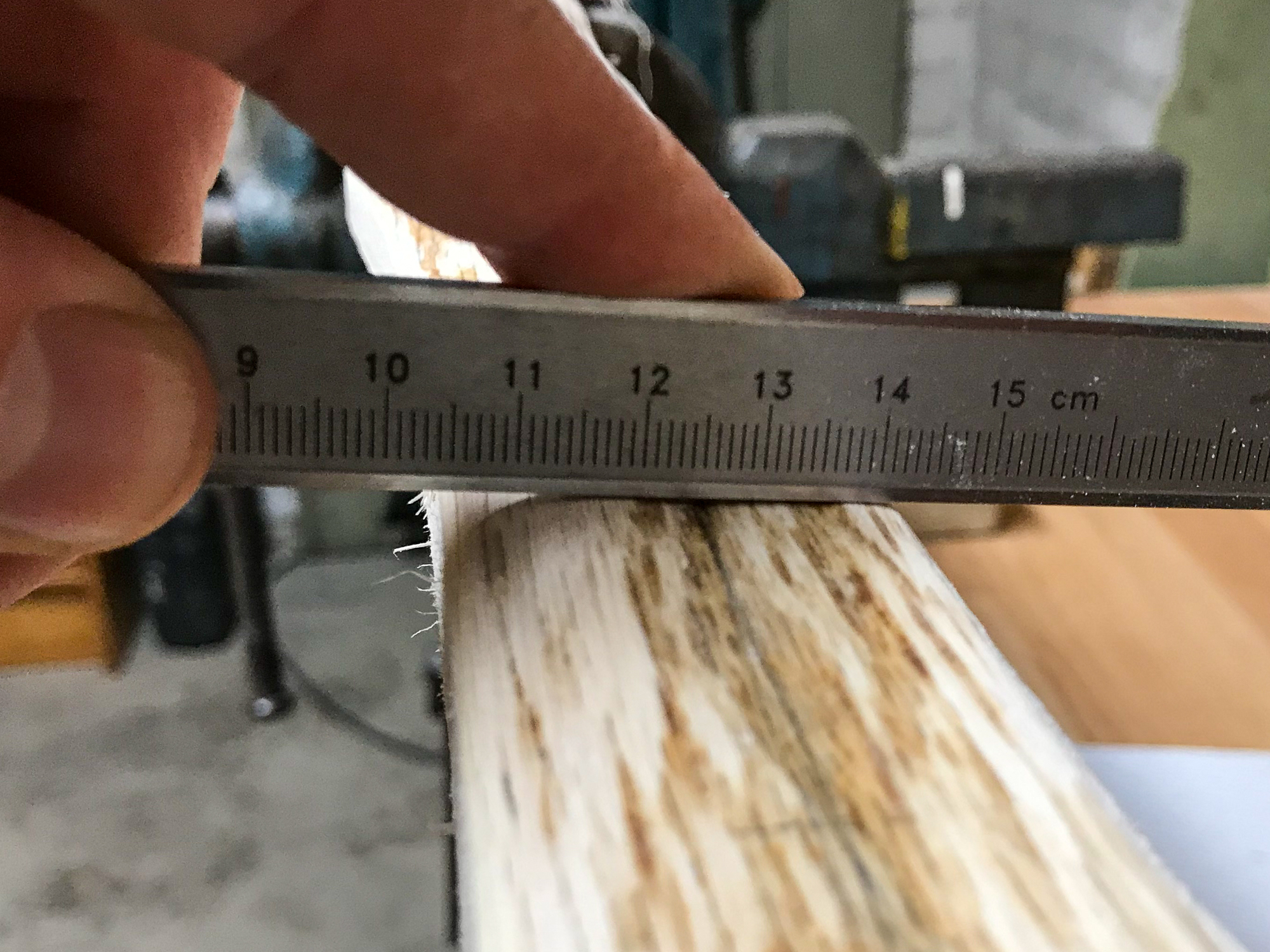 Jetzt ist er fast auf Endmaß und muss noch weiter trocknen. Ziemlich viele eingewachsene Äste, die von Außen nicht absehbar waren, aber er ist noch breit genug. Am oberen WA gibt es eine ziemlich knubbelig-vergriesgnaddelte Stelle, bei der ich erstmal einiges habe stehenlassen, allerdings wäre das viel Masse kurz vor Ende des biegenden Bereichs.