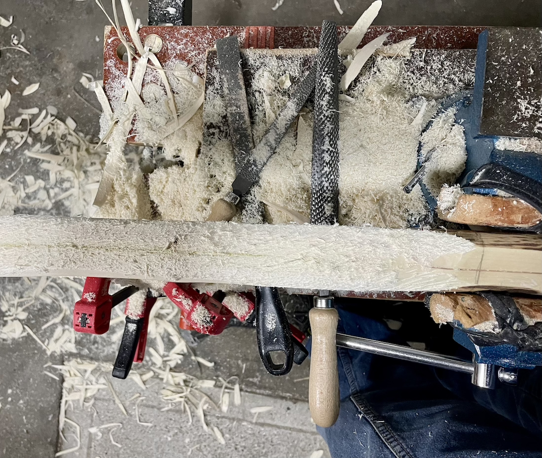 Danach den hab ich Grifbereich grob in Form gebracht. Mit der Raspel habe ich noch die Bogenform etwas verfeinert. Die Sehne läuft jetzt nicht mehr am Griff vorbei aber auch nicht ganz mittig . Etwas verdreht hat er sich auch.