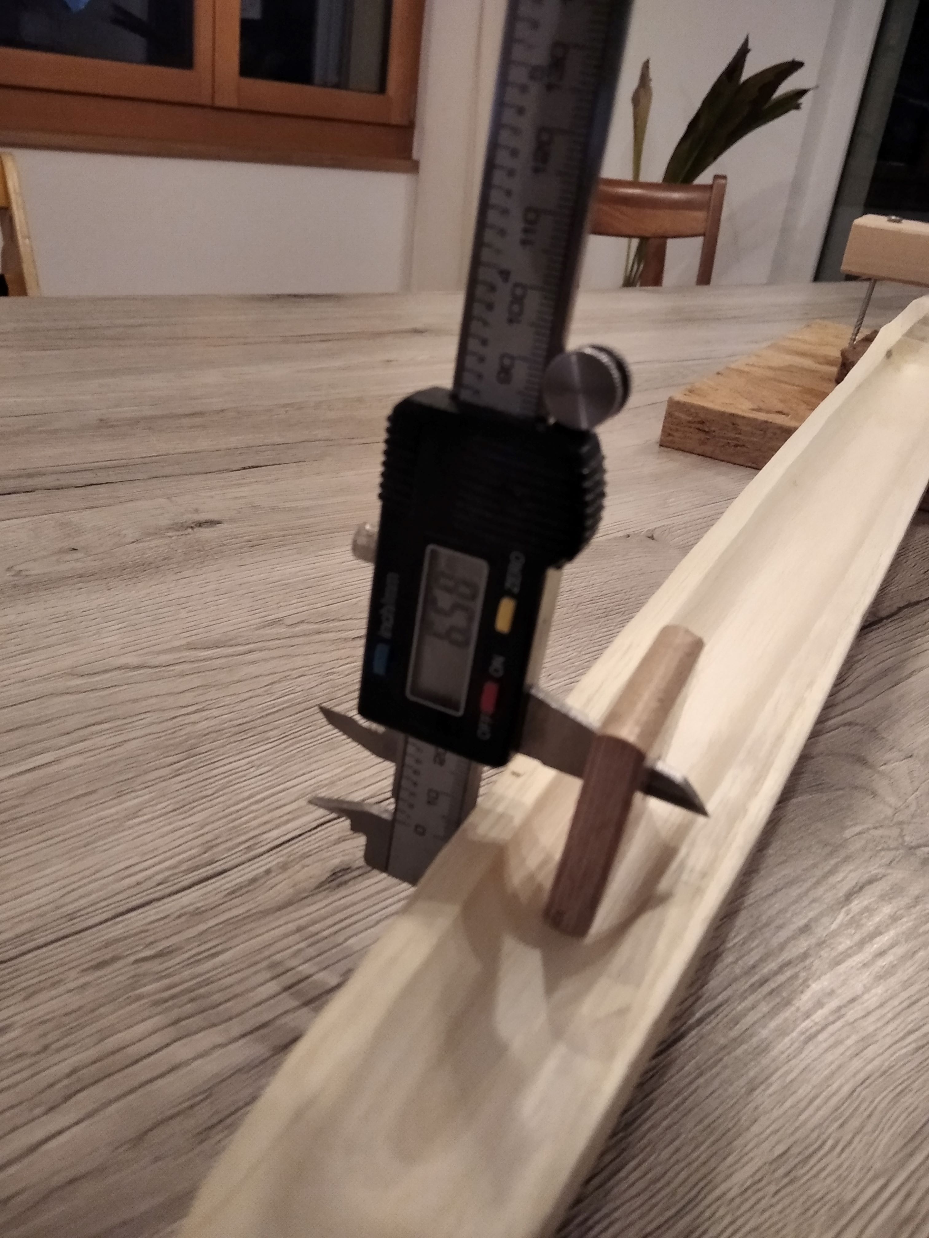 Der digitale Messschieber eignet sich hervorragend, um die Wandstärke zu messen. Zum Glück gibt's die Taste zum nullen... Und so sieht der hohle Wurfarm nun aus: In der Mitte der Kehle ist der Wurfarm von 8 mm bis 6 mm dick.