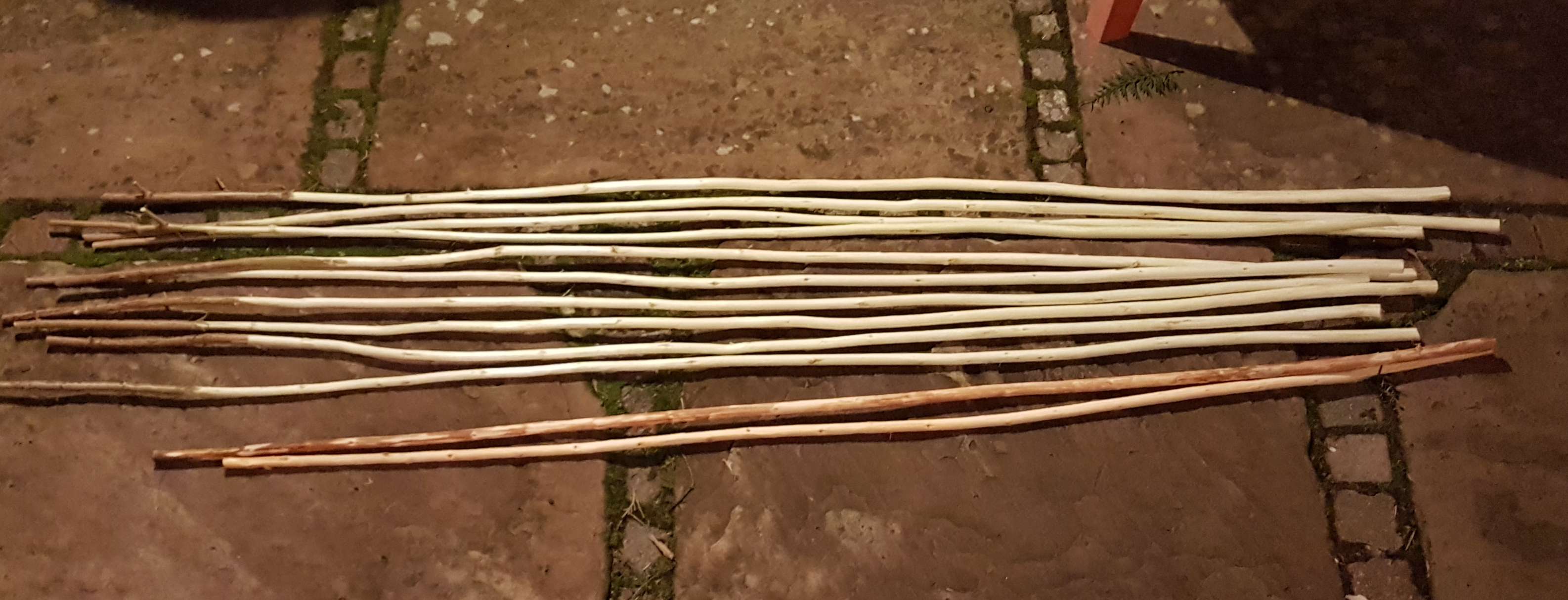 Die Stängel sind entrindet und werden morgen genau betrachtet, gekürzt und zum ersten Mal gerichtet.