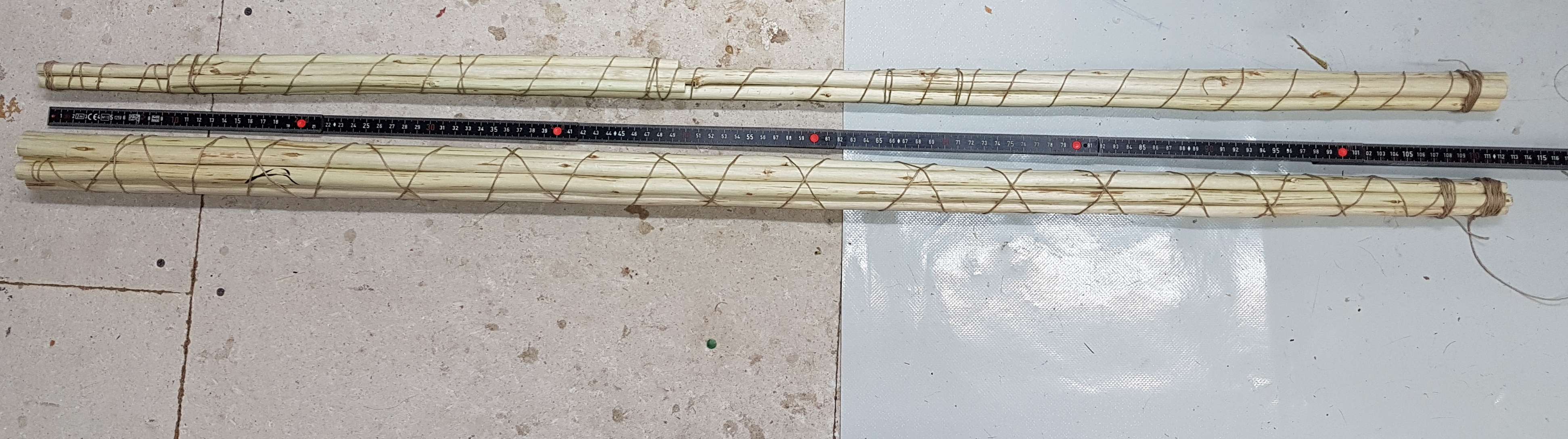 Außerdem wurden die Haselstängel gekürzt, gerichtet und gebündelt. Bis auf eine Ausnahme sind alle Stängel ca. 14 mm auf der dicken Seite und ca. 9 mm auf der dünnen.