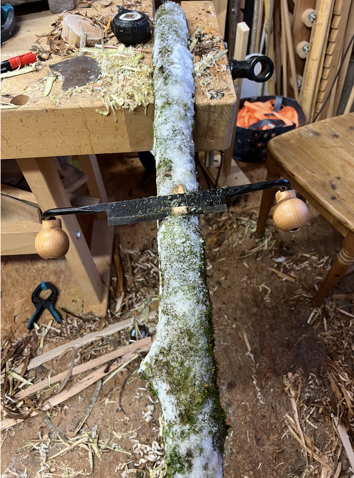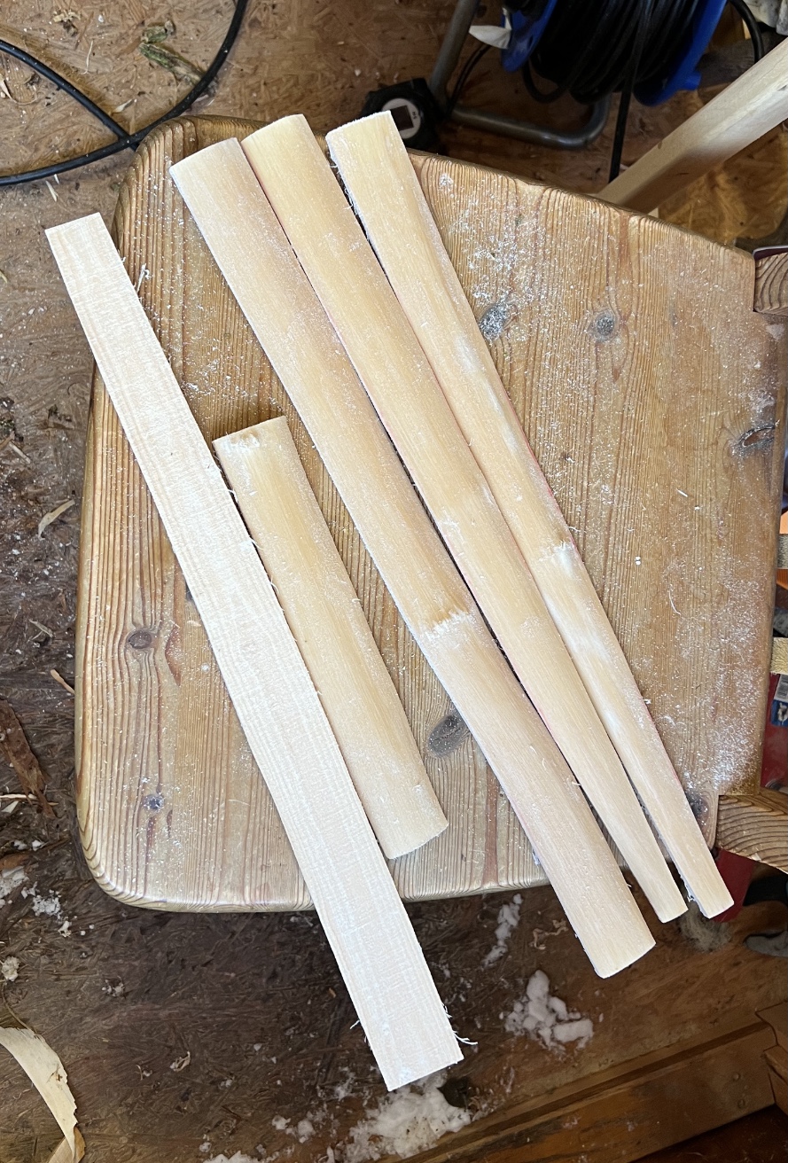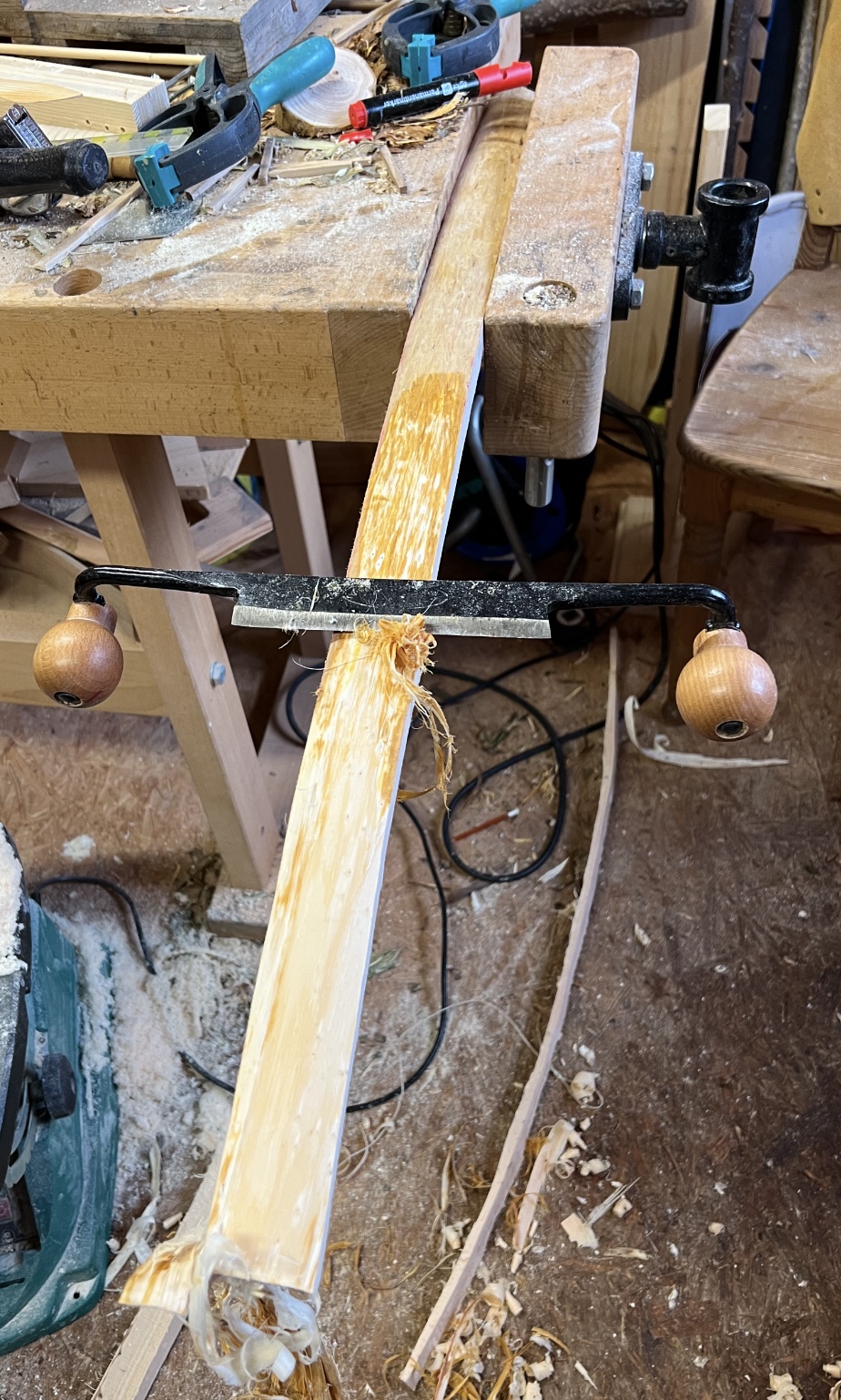Dann habe ich noch den Hasel 1 entrindet und mit der Bandsäge geteilt. Die deflexe Hälfte habe ich mit dem Ziehmesser in eine rechteckige Leiste verwandelt, ca. 1m lang. Dann habe ich noch die Abschnitte vom Hasel 2 mit der Bandsäge halbiert und mit dem Messer entrindet.
