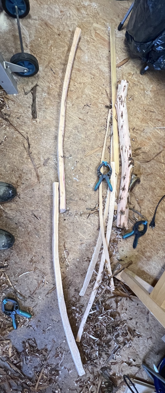 Heute durften die restlichen Kandidaten in die Schnitzhütte: Späte Traubenkirsche, Hasel 3, Holunder und die Wildkirsche. Die Späte Traubenkirsche bleibt in der Rinde, ist nur aufgespalten und muss aufgrund der Länge später im Griff gespleißt werden. Der Hasel 3 hat extremen Drehwuchs und ist damit aus dem Rennen. Der Holunder ist entrindet und gespalten, hat kaum Drehwuchs. Habe ihn gleich auf Bogenmaße herunter gearbeitet und zerstückelt. Dann am Brett aufgespannt. Was daraus wohl wird? Auch beim Wacholder hat sich der Plan geändert. Für einen Paddelbogen zu kurz wird er jetzt was anderes. Der Biegetest mit einem Abfallstück ist sehr viel versprechend. Habe gleich eine Biegeschablone angefertigt und die Teile für morgen vorbereitet. Was daraus wohl wird?