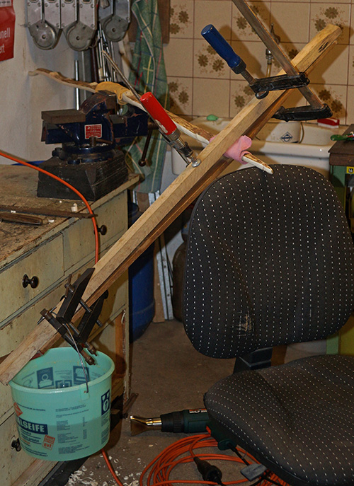 Als erstes am Griffstück in den Schraubstock eingespannt, den zu richtenden Wurfarm von unten abgestützt (damit er sich nicht nach unten biegt). Im äußeren Drittel zwei Holzleisten (mit Filz-Beilage) mit je einer Schraubzwinge links und rechts auf den Wurfarm geklemmt, mit einem Gewicht belastet und langsam und gleichmäßig mit der Heißluftpistole erwärmt, bis sich der Wurfarm ausgedreht hat. Dort heiß machen, wo es sich drehen soll, das Holz sollte nicht braun werden. Ein bischen "über Null", da sich der Wurfarm wieder ein bischen zurück dreht, ich hab auch zwei Anläufe gebraucht. Das Gewicht war einfach ein Eimer, gefüllt mit allem was grad da war (Werkzeug), den ich auf die Holzleisten gehängt habe.