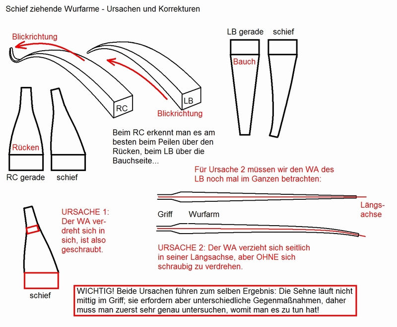 Ich habe folgendes Problem: Der eine Wurfarm des Bogen an dem ich gerade arbeite, hat eine leichte gewachsenen Verdrehung. Dadurch verzieht er sich beim Auszug nach einer Seite (siehe oberste Skizze unten).