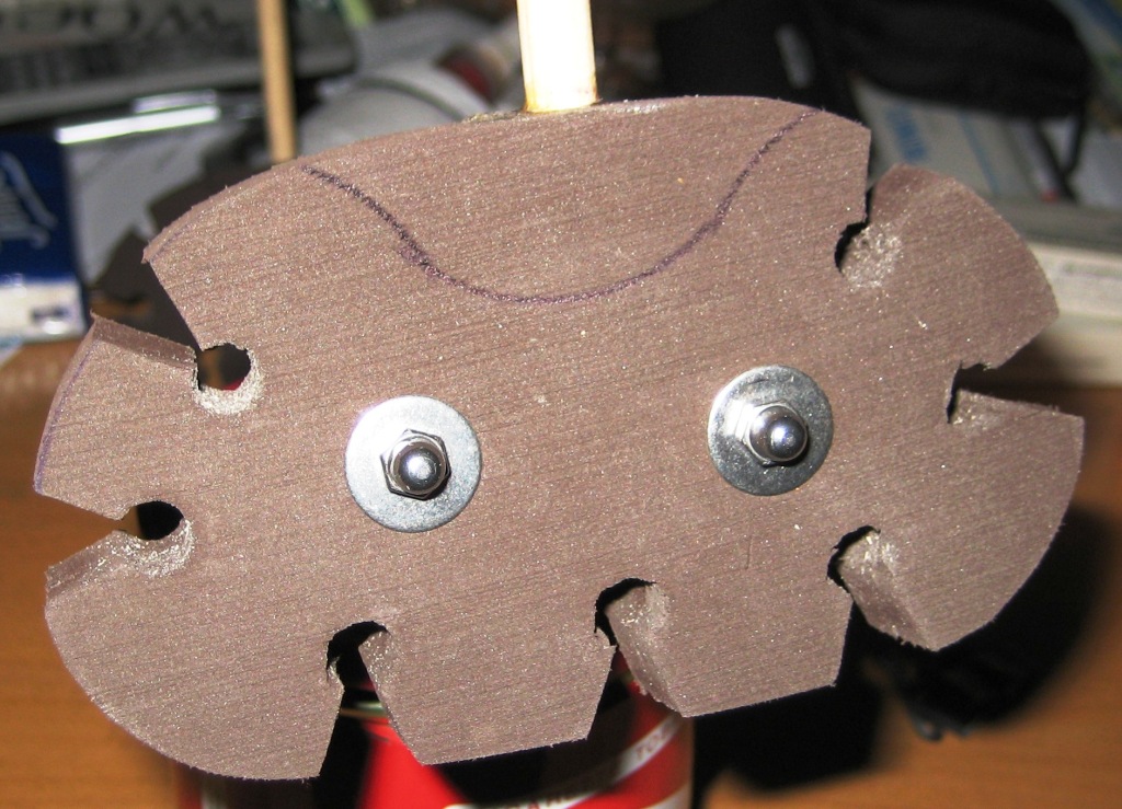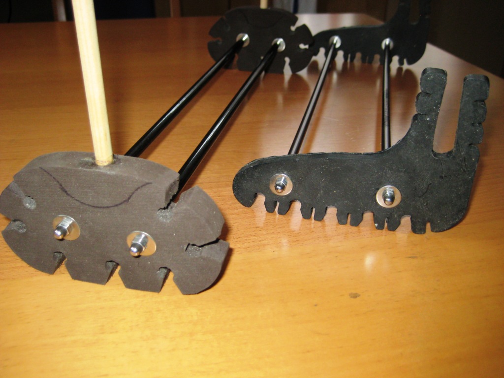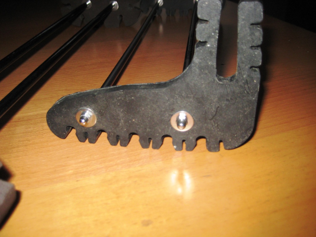 Die Abstandshalter bestehen aus Gewindestäben M4, einmal ( Hartgummi ) überzogen mit einem alten Alupfeil, beim anderen ( Schaumstoff ) mit Carbonrohr aus dem Drachenbau.