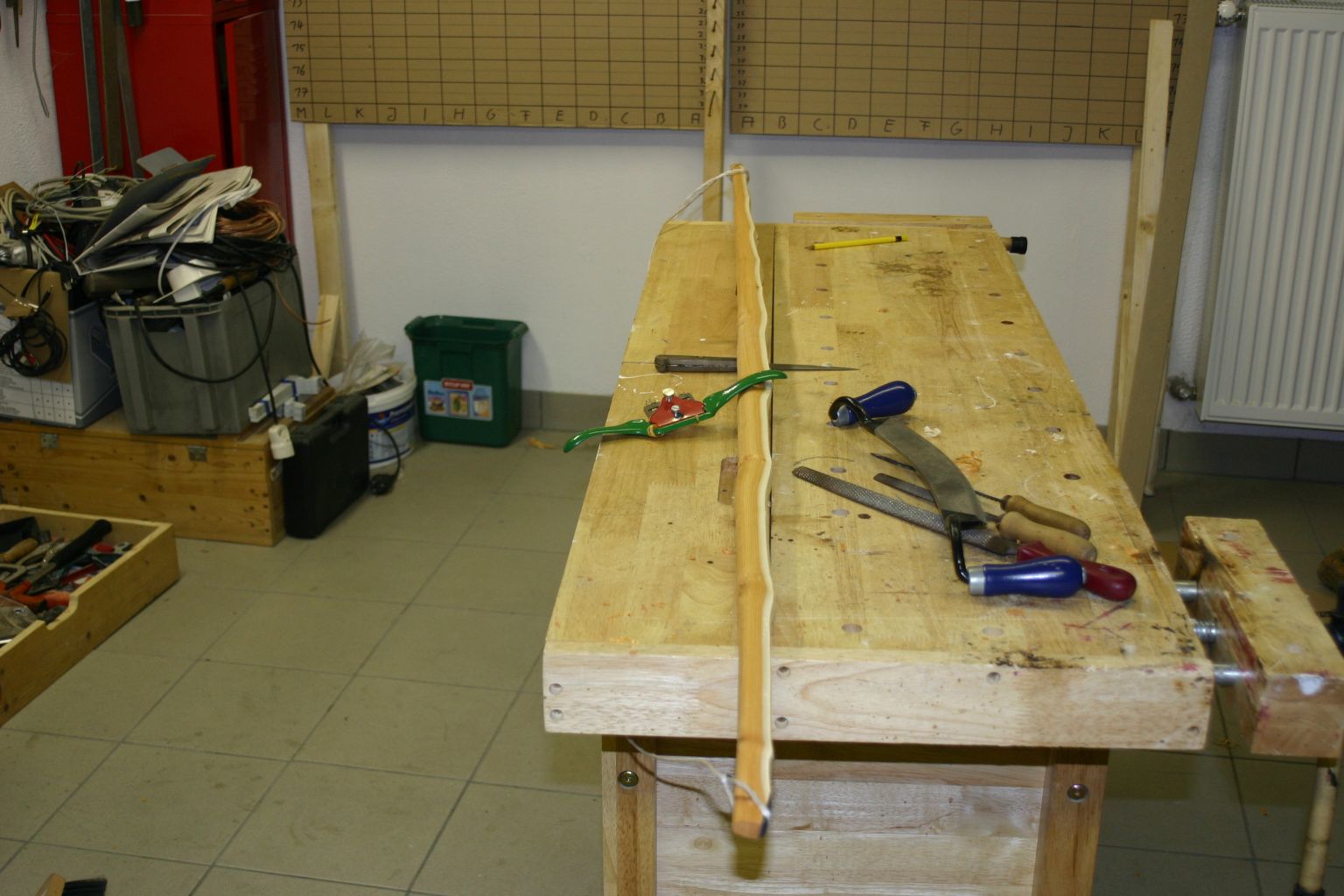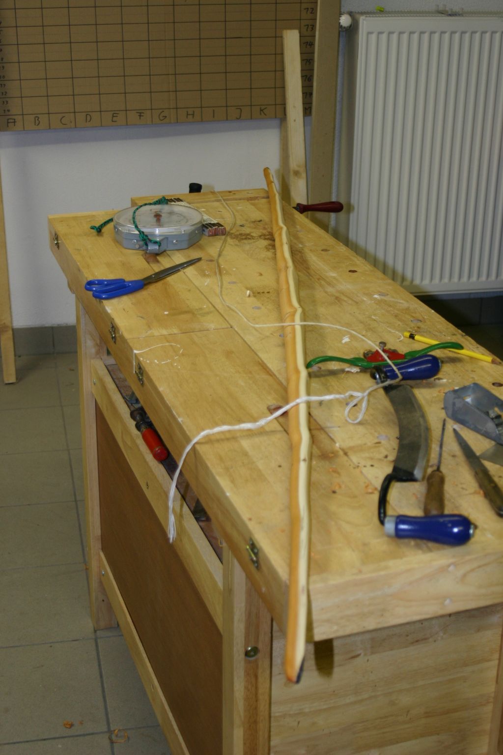 Die Nocken Ausarbeiten, den Bogen noch etwas schmälern, mit dem schweifhobel vis zu einem akteptablem Bodentiller arbeiten, dann mit dem Ziehmesser die Maserung wieder herstellen (der schweifhobel hat alles "planiert"), per Ziehmesser fertigtillern, merken das der Bogen mit 100# noch etwas zu stark ist ^^, dann mit der Ziehklinge auf 90# runterbringen und noch etwas schmaler machen, die Tips auf ihre endgültige Stärke 9-10 mm bringen, tips neu zurechtfeilen (sind ja schmaler geworden) dann alles am Bogen glätten, die scharfen kanten zum Rücken hin brechen und abrunden, Sehne anfertigen.