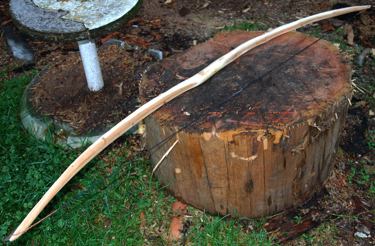 Bei diesem ersten Projekt war die Frage geht aus diesem dünnen Ast was vernünftiges also ein netter kurzer Bogen mit mindestens 30# Zuggewicht.