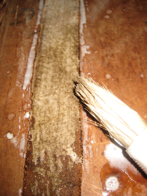 1.Backingstreifen und Hanfbacking dünn mit Leim eingepinselt<br />2.noch etwas dicken Leim aufs Backing