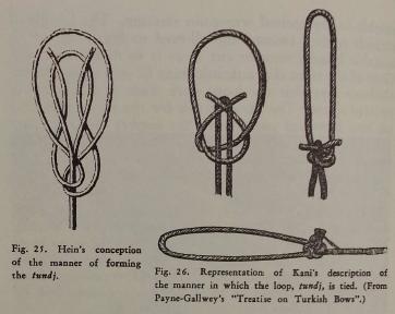 Aus den oben genannten Gründen sind (laut Mehmet Gölhan) die Sehnenschlaufen bei den Osmanen nicht verdreht sondert verknotet. Hierzu verweist er auf die zahlreichen in den Museen zu besichtigenden Orginalsehnen der osmanischen Bögen bei denen die Sehnenschlaufen ebenfalls verknotet sind.