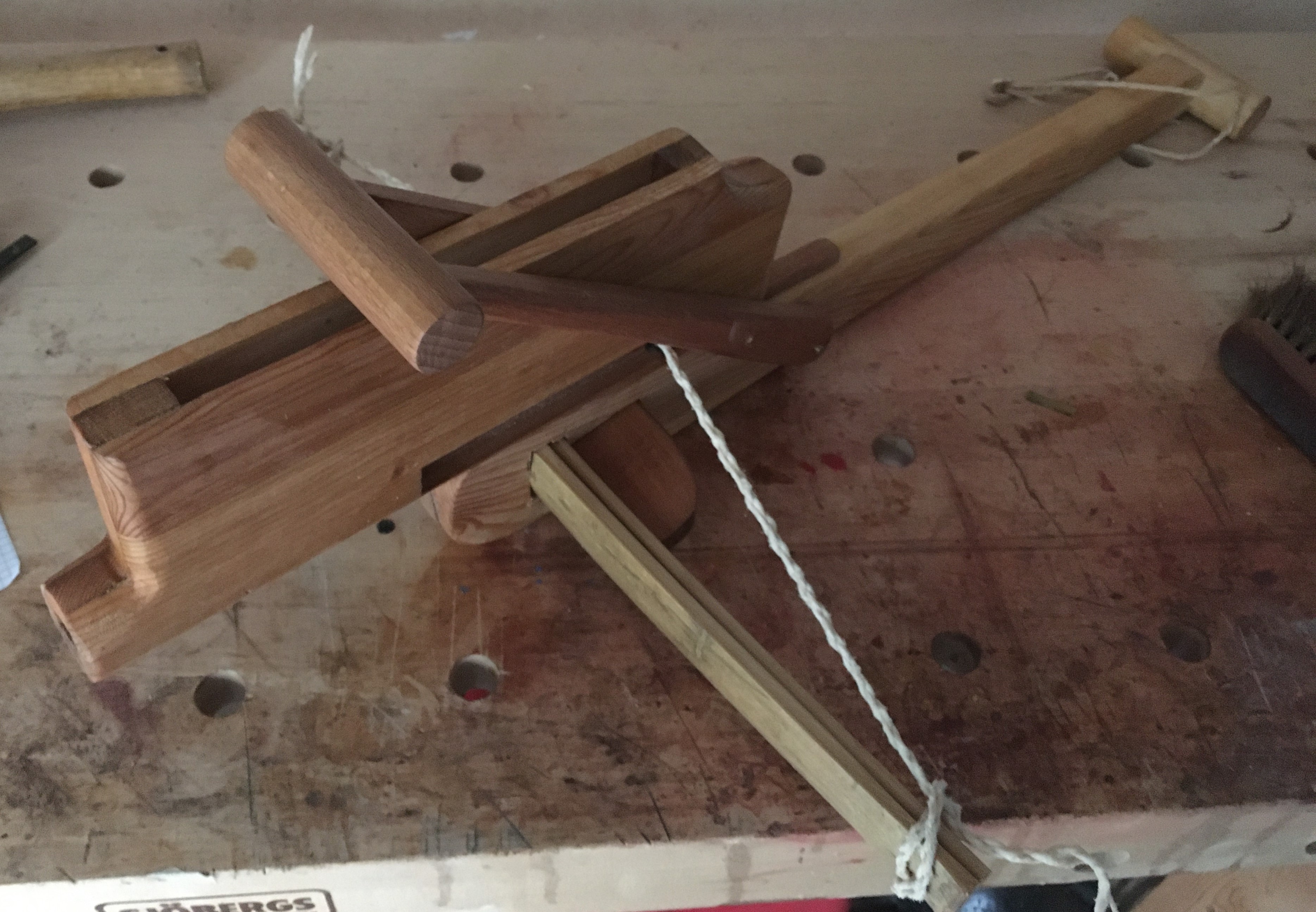 Wichtig: Die Sehne ist aus gezwirbelter Rohhaut. Eine dicke selbstgezwirbelte Hanf-sehne ist nach zehn Schuss durchgescheuert. Für den Auslöser habe ich Wasserbüffelhorn verwendet. Geht tip-top.