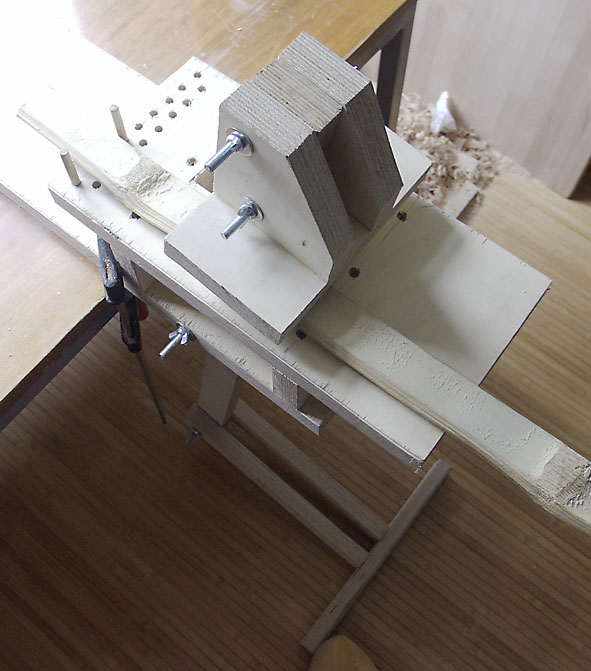 Durch verschiedene Bohrungen kann der Teil in der Mitte verstellt werden. Ob flacher Bambus oder halber Baum passt somit alles rein. Der Teil der das Holz festhält hat an einer Seite eine dreieckige Aussparung um Runde Staves zu halten. Und vorne hat er jetzt die von Toaster vorgestellte A.S.A.S. Anti-Stave-Ausweich-Steckomatik