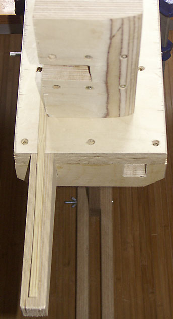 Er besteht aus 30 mm Birkenmultiplexholz von meinem höchst verständnisvollen Holzhändler, ein paar acht mm Schlossschrauben mit Flügelmuttern und U-Scheiben, einer acht mm Gewindestange als Achse mit Stoppmutter, Flügelmutter und U-Scheiben, ein paar Holzschrauben und last but not least etwas Holzleim. Kosten etwa 20 Euro.