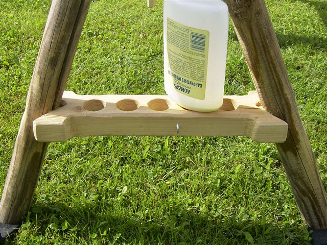 Es ist ein Schnitzpferd mit drei Beinen. Hinten kann man fast leere Leimflaschen reinstellen, damit der Leim nach unten läuft. An dieser Querstrebe ist ein kleiner Haken, an diesem drehe ich meine Flämische Sehnen.