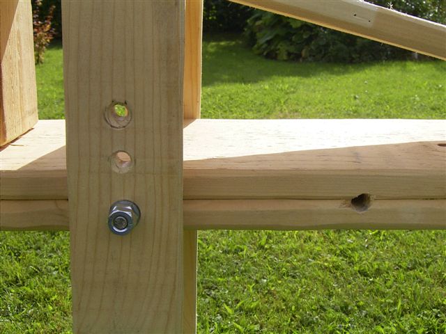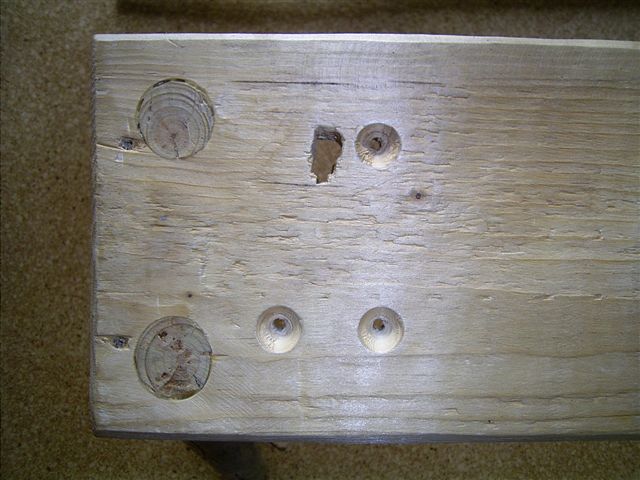 ) 6 Löcher gebohrt und Kiefernrundstäbe aus dem Baumarkt hatte ich noch. In den Stärken 10 und 13mm. Hab mich für die 13mm entschieden da ich, wenn da so ein verfluchtes Astloch ist, doch schon ordentlich drauf rumjuckel