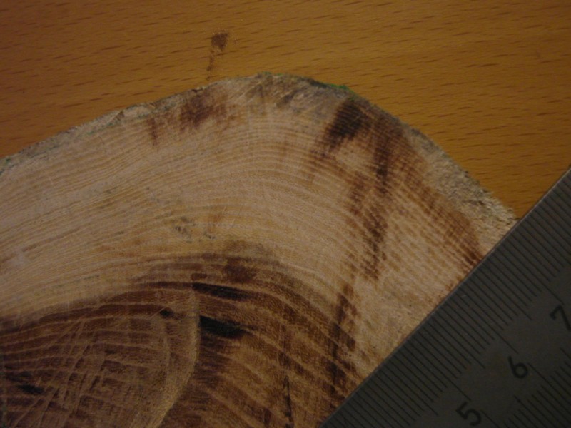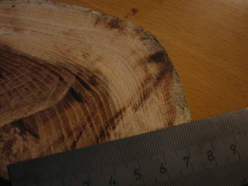 was mich verwundert ist der aufbau der jahrringe,vom markkanal bis zum ende des dunklen holzes(ca.25ringe) nimmt die ringbreite stätig ab und nochmal mindestens 20-30 ringe so dünn das mer sie kaum zählen kann.also vom aufbau her wie eine eibe mit extrem dünnen jahrringen außen.