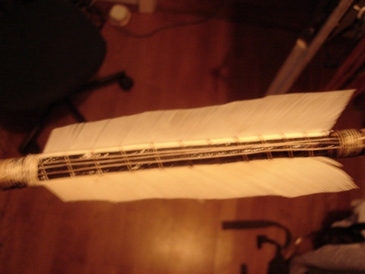 Die Idee dahinter ist daß das Garn die Reibungskräfte in Längsrichtung viel besser aufnehmen kann als quer. Ich habe also einfach ein paar Fäden längs über die Wicklung gelegt und ober- wie unterhalb der Feder unter einer anderen Wicklung verschwinden lassen. Das mache ich natürlich nur auf der dem Bogen zugewandten Seite des Pfeiles. Wenn man wie ich hier mit Birkenpech arbeitet braucht man die Fäden nur anzudrücken und sie verrutschen nicht. Sonst müßte man eben mit einem anderen Kleber nachfixieren.